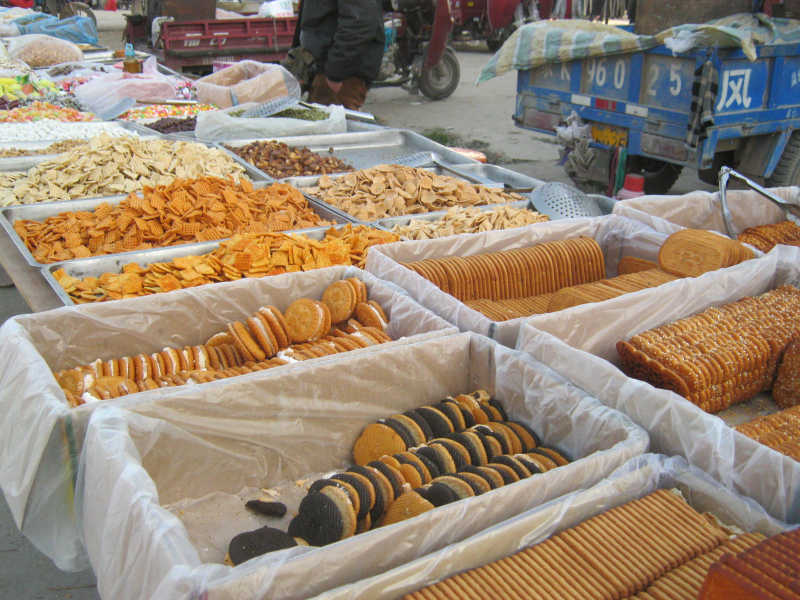 集市上,最令人谗言欲滴的不是衣服,绸缎,鞋子.而是美食.在集市上,无不有人喜欢它,也不会有人不讨厌它.以为它美味,人人都会喜欢它,尤其是小朋友们,最喜欢夹心饼干.而且价格也是很便宜的,听了我的介绍,相信大家一定都口水\'飞路直下三千尺\'了吧.
