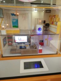 令我印象深刻地是一个模拟的房子,房子外面中间是每个房间的开关。当你按客厅的开关时,客厅里的电视和音响就会自动打开;当你按卧室开关的时候,卧室里的吊灯和窗帘就会打开;当你按厨房的开关时,冰箱和电饭煲就会亮起。这个模拟的房子还可以根据个人的喜好来改变房子的风格,如果人人都有这样的房子。那该多方便呀!