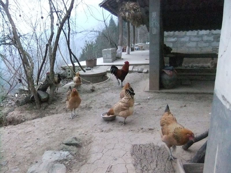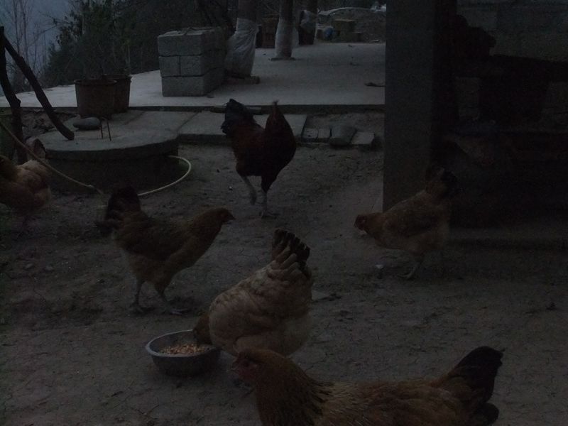 我知道它一定饿了,就回屋里抓来一些玉米喂它吃,同时也引来了其余几只母鸡斗争着抢食吃。大公鸡抢在母鸡前面,用嘴一啄,把我手里的食盆啄走了,其余几只母鸡也不甘落后,就像运动场上的运动员你争我啄,瞬间地上也留下了带米子的脚印。