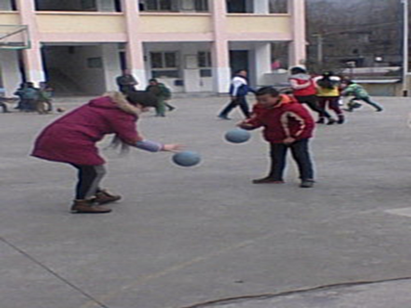操场的那边,有一群小同学在老师的带领下拍皮球。他们拍得多认真啊,可是只能拍两三下,皮球就顺着操场"跑"了,他们捡都捡不过来,这使他们哭笑不得.。这时,何老师就交给他们拍球的方法:"不要拍得太高,拍完一下,等皮球落在一定的高度时,再拍第二下。"老师还给同学们亲自示范,让学生跟着学,他们学得可开心了。