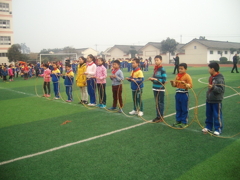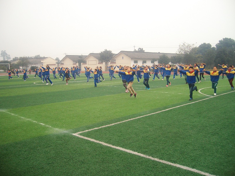 在趣味比赛开始之前,1-9年级分班进行了班级阳光体育展示,1-8年级展示的是绳子操,二我们9年级展示的是队列队形变换。 首先是9.1班进场展示,他们一会儿左转,一会儿右转,一会儿又进行穿插,最后他们走成一排,逆时针旋转。这时全场都把掌声给了他们。 看完他们的表演,我想我们肯定比不过他们了。这时,周老师走过来对我们说:"别灰心,大胆地走,走出我们的风采就行。" 虽然我们的变换没有一班的多,但我们的口号响亮。