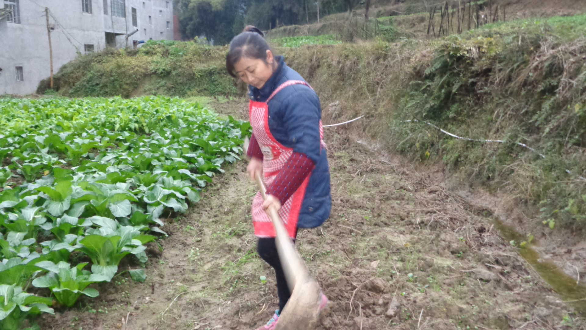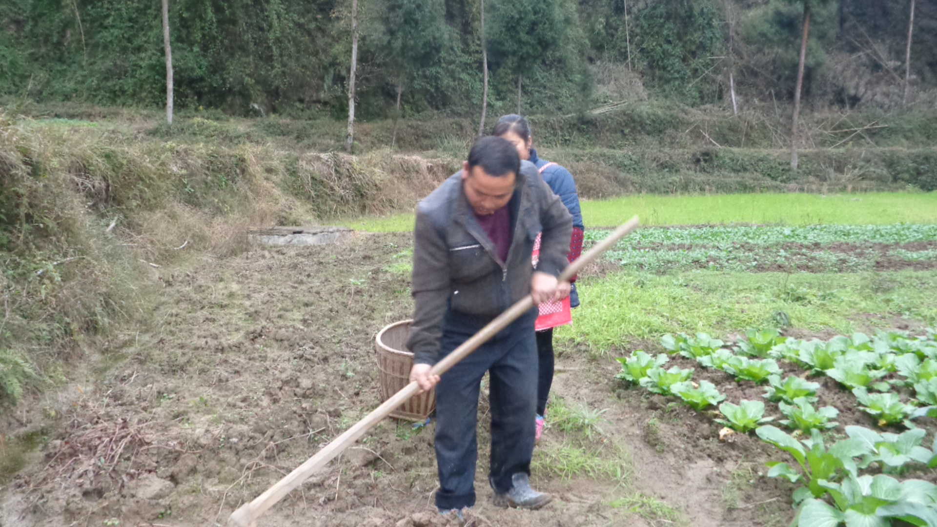 拔完草以后,爸爸开始拿起锄头,准备开始松土,每挖一次,爸爸就会用锄头敲一下,这是因为要把泥土敲碎,以便好挖沟沟种土豆。
