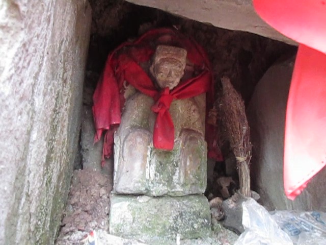 我们这个地方,山头山脚或多或少都会有一两处人们所供奉的一两座小小的庙宇,里面住着观音, 土地神啊什么的。他们被雕刻得栩栩如生,这样的佛像大都被安置在路边的山坡上。当地的人们便把佛像周围用石板围起,呈一个开口式的小庙,这样既有利于人们祭拜,又有利于佛像本身的清洁。