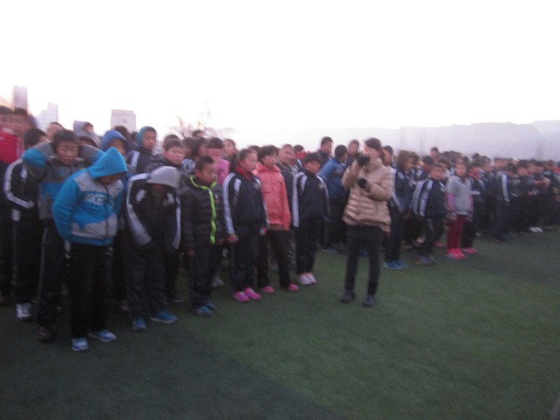 困难是压不倒我们的! 我和同学们排着队伍绕着操场跑着,在体育老师的指挥下,队伍逐渐变得整齐。跑着跑着,寒冷似乎被我们给吓跑了。我的身体逐渐热了起来,鼻尖还沁出了小汗珠。我往后瞄了一眼,有很多老师甚至是老教师都跟我们一起跑着,这可真是"师生锻炼齐跑步,任尔东西南北风"啊!