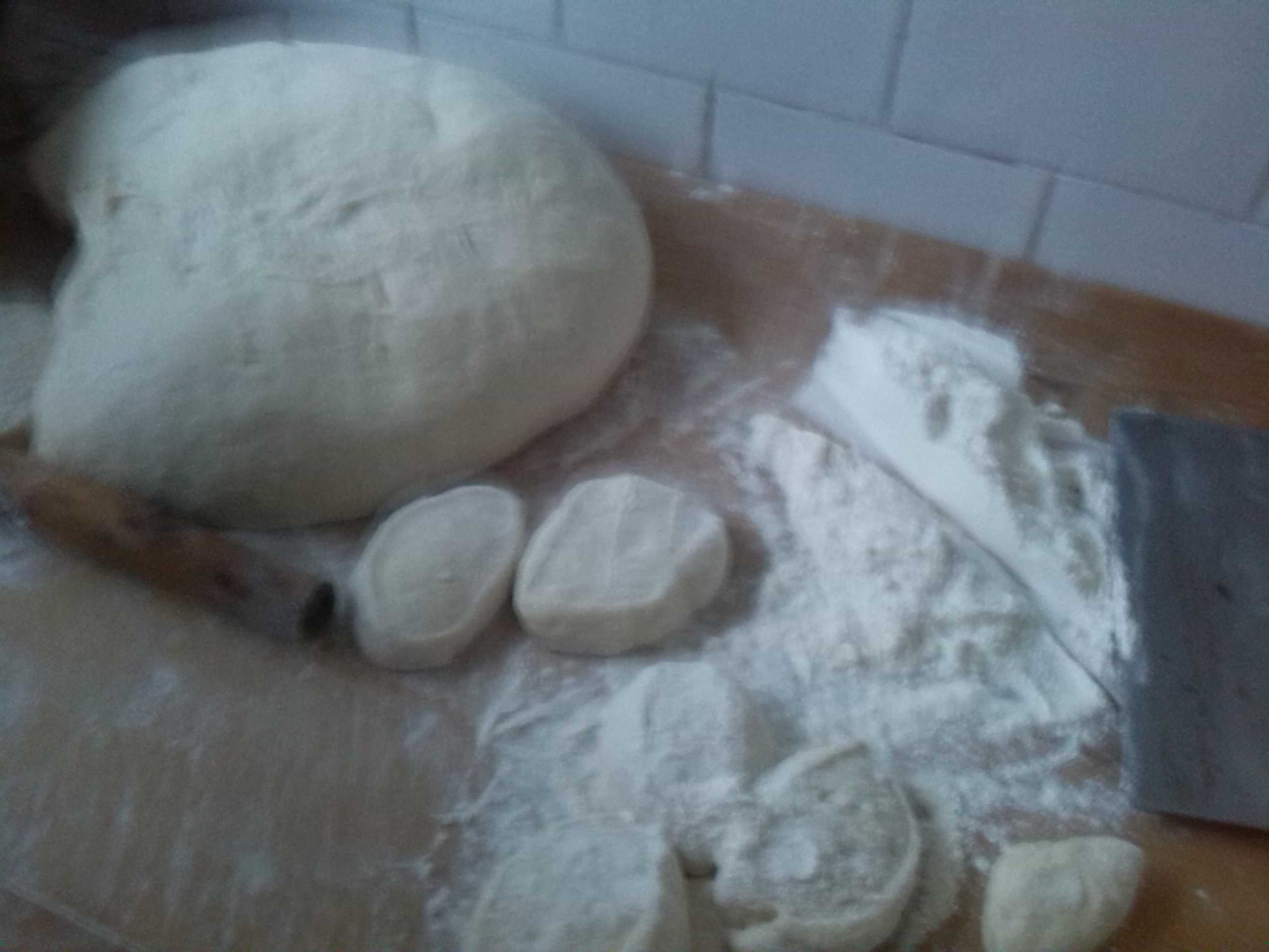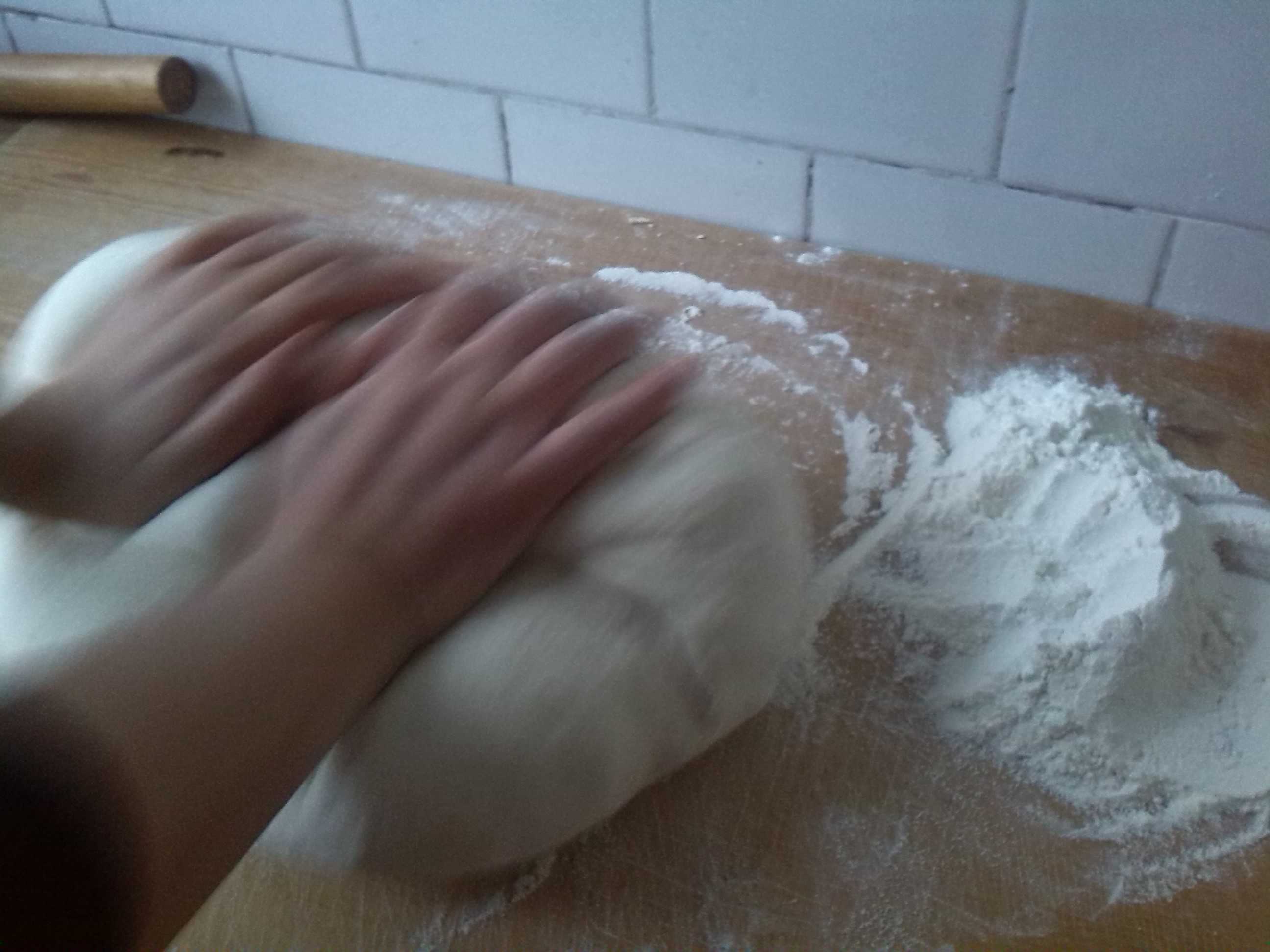 接下来,便是正式开始包包子了,妈妈把面团切成小块,我再把小块的面团搓成圆柱体,用手把它压扁,然后用擀面杖把它擀成又圆又大的面皮。紧接着,在把面粉撒在面皮上,然后就开始包包子了。