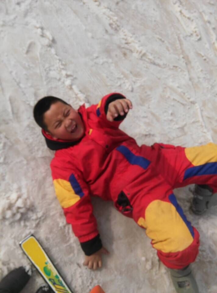 滑了一会儿,我突然摔倒了,而且,我穿着雪鞋还起不来,最后还得爸爸把我抱起来。爸爸还说:"我差点儿没有把你抱起来,太胖了!"(我也该减肥了,嘻嘻!)