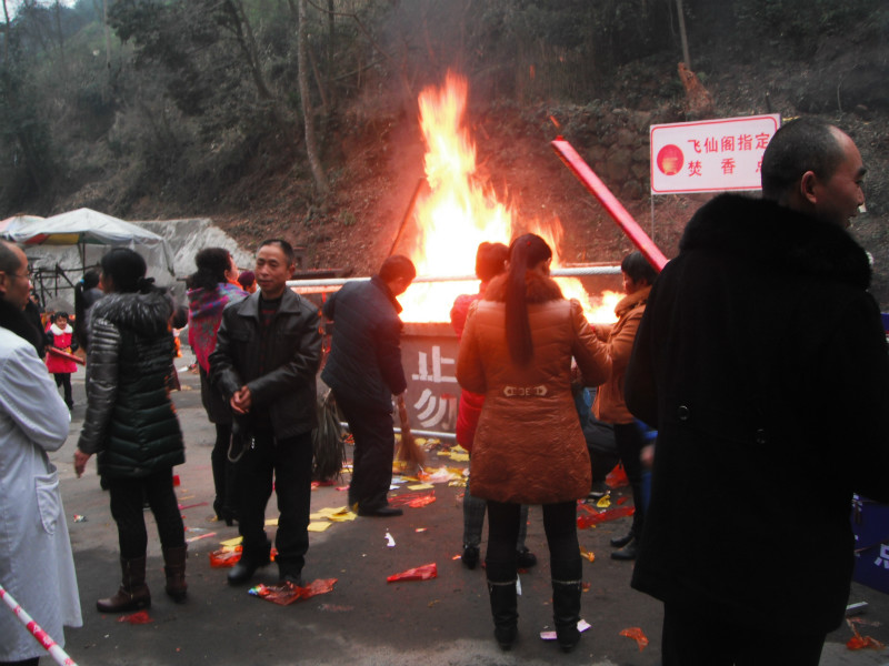 今年烧香祈福与往年略有不同,那就是人们在各处神龛佛像处虔诚祈拜后,将祈福后的香烛纸钱拿到"焚香指定点"集中焚烧。那是一个巨大的矩形炉子,炉子里香烛燃烧正旺。旁边竖着一个警示牌,上面写着"飞仙阁指定焚香点"。游人们纷纷将手中的香投入里面,再深深地鞠三个躬,以求神明的保佑。