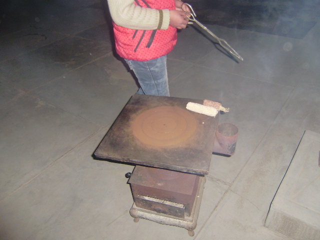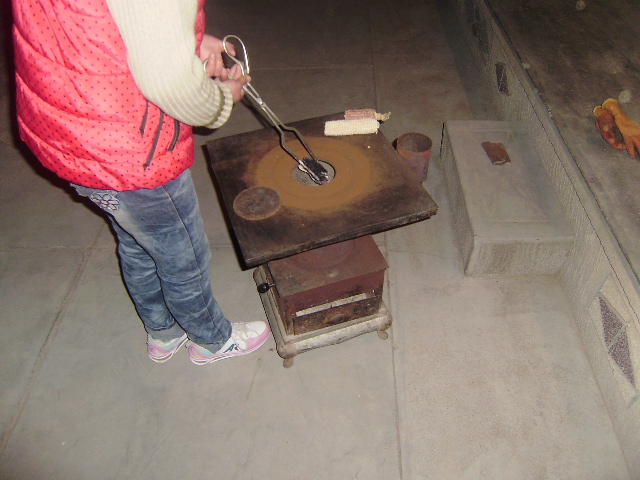 接着,姐姐就去了厕所,回来时手里捧着一堆玉米棒,然后就照样把玉米棒一个一个的塞了进去,塞完之后,就盖上了盖子。最后,在炉子的左边还有一个黑色的球,舅舅使劲拽着它摇了几下,便生完炉子了。