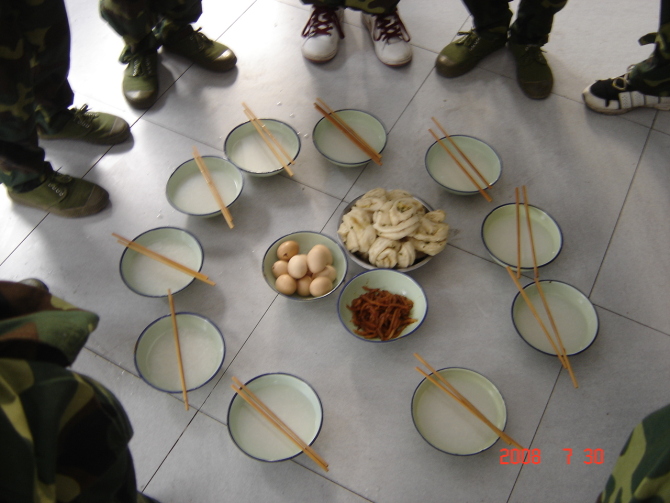 我不了解军训生活是怎样的,但这日子应该很艰苦吧!大家都在一起训练,一切东西都是一样的,没有人有特权。早餐仅仅就只有这些。不过我想,既然是军训,当然不是随便的咯!