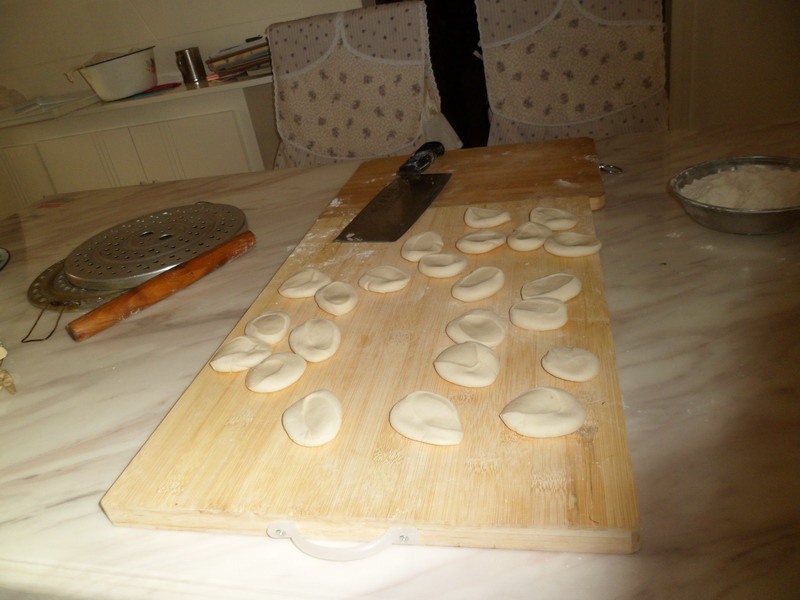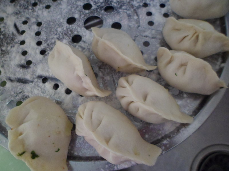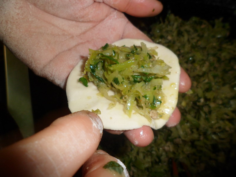 最后,包饺子,把面皮放在手心里,夹一点菜放在面皮中间,切记,不要太多,然后把面皮两边合拢、捏紧,力量不要太大,会把饺子弄破的,力量太小,饺子包不住,煮的时候就会露馅,所以要用适当、均匀的力量,才能包成一个完整的饺子。这也是一门学问呢。