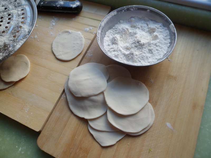 首先,把菜洗干净,然后切成片状,再切成条,剁碎,然后放在锅里炒一下(这样包出来的饺子特别香),留着备用,这就是饺子馅了。紧接着,把面和好,然后将面团搓成长条,如果太长,可以用刀切成两半,然后用刀把长条切成一个个大小均匀的小块,然后把小块按扁,用擀面杖擀成圆形,要中间厚,边缘薄,这就是饺子皮。