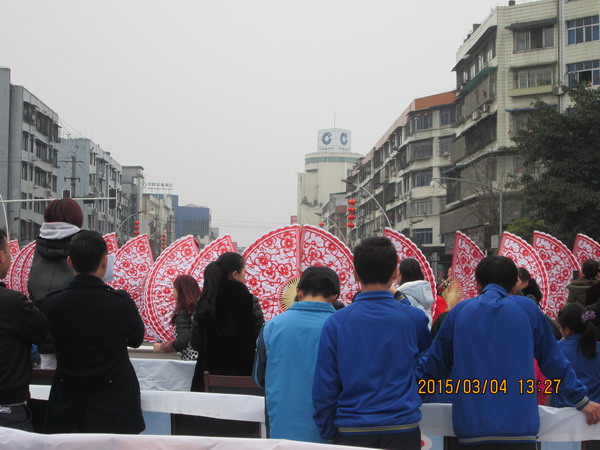 比赛当天下起了小雨,整个天阴沉沉的。我们到了蒲江广场后才发现天气原因并没有改变一切,广场上到处都充满着喜庆,特别热闹,到处都是人山人海,到处都挂满了红红的灯笼,给人一种喜庆的感觉,一到那里,每个人都不禁露出了甜甜的微笑。我们是第五的上场,所以就在一旁边看表演,边等着上场。该第四个了,第四个舞蹈是一群阿姨跳的扇子舞,她们的道具特别漂亮,扇子一打开应该有一两米高,扇子上面有许多看似是剪出来的花,真的很美。她们的表演非常的精彩,评委和观众的掌声也表达了一切。