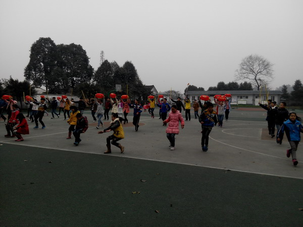 在排练时我们都特别的辛苦,有时要排练整整一天,但社区的工作人员也对我们特别好,时不时会给我们送来好吃好喝的。舞蹈老师更是对我们关怀备至,所以每次排练,我们都十分认真。参加跳舞的人员是中学男女生各20名,小学男女生共20名。中学女生的道具是一个能收缩的红灯笼,小学生的道具都是系有铃铛和彩带的花杆,都特别的轻,而中学男生的道具则是一个绑有一只羊的花杆,有点重,所以男生在跳舞时常常控制不了羊的方向。他们的道具那么重,跳完一天舞,手都会酸吧!