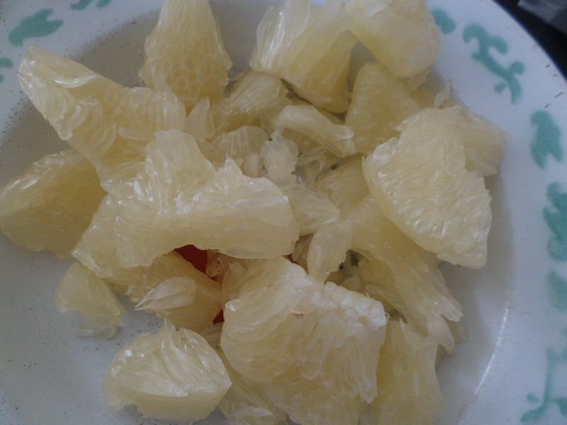 柚子的皮很后,剥起来格外费事,但对于我这种"资深吃货"来说自然不是什么难事,先用刀在上面划开一道口子,然后从口子那里入手,朝两边用力撕开,里面有一层厚厚的东西,有点像棉花,软软的,同样散发着香味,把它剔干净,就可以看到里面的果肉了,像橘子一样,是一瓣一瓣的,不过是青色的,把它放在阳光下,晶莹剔透的,像美丽的宝石,吃起来美味极了,轻轻一咬,果肉就迸发出果汁,甜甜的,还带着几丝酸味,满口馥郁的清香,好吃!