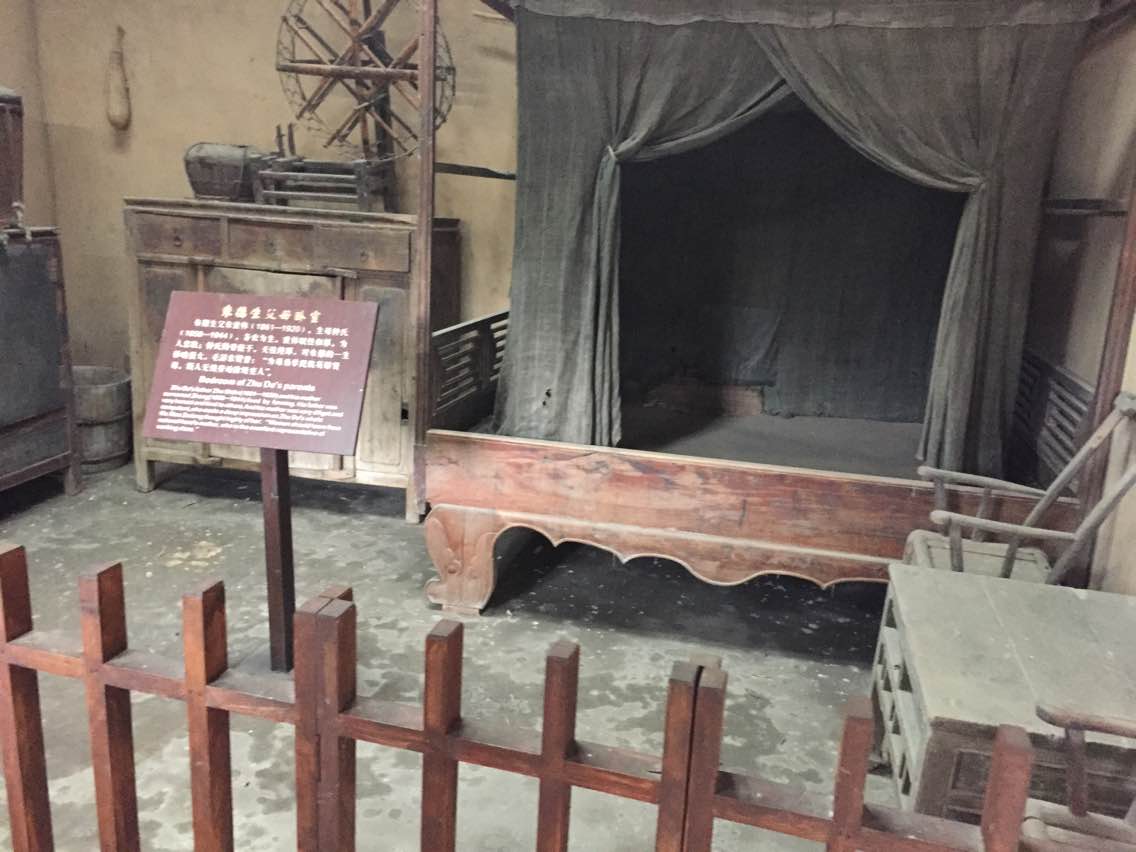 沿着一条林荫小道拾级而上,大约经过二十分钟便来到了一座旧式川东民居旁边,走进院子便看到门前赫然写着"朱德故居"四个字。里边摆放着朱德当年学习生活劳动用的家具,显得十分陈旧,由此足见,朱德总司令小时候家里是多么穷困啊!来到朱德的房间,里边还完好的陈列着总司令当年在家读书时用的桌子、桐油灯盏和椅子。朱老总当年生活那么艰苦却为新中国做出了卓越的贡献,我们今天生活条件那么优越,不好好学习简直对不起革命前辈呀!