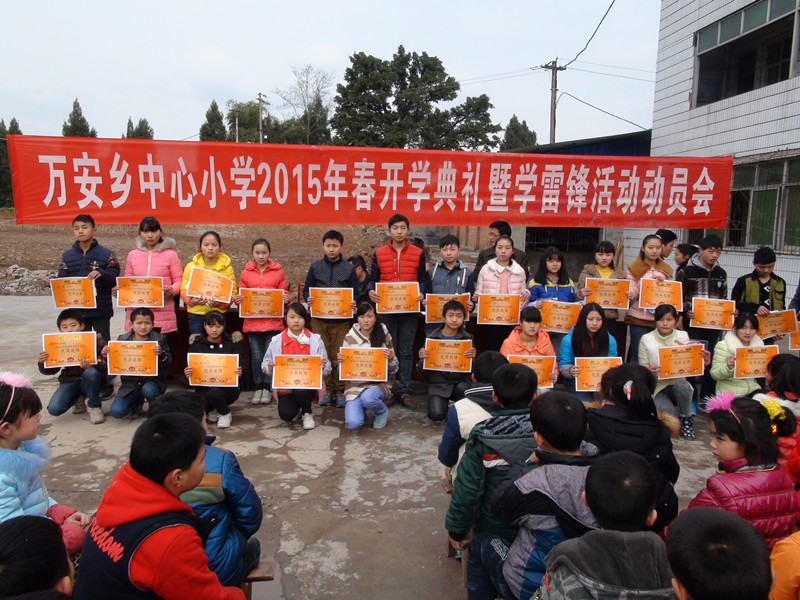 欢歌笑语辞旧岁,春雷涌动迎新春。3月5日上午,恩阳区万安小学全体师生齐聚该校大操场,举行2015年春季开学典礼暨学雷锋动员大会。开学典礼现场开学典礼上,该校校长杨廷金作了致辞,对上学期全校师生取得的成绩给予了肯定,并提出了新的要求和期望。他希望老师们不断加强学习、更新知识、转变观念、提高师德素养和服务意识;激励同学们珍惜时间,刻苦学习,养成良好的行为习惯,努力践行社会主义核心价值观;告诫全体师生提高安全防范意识和自我保护能力。
