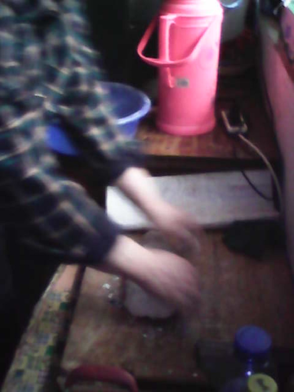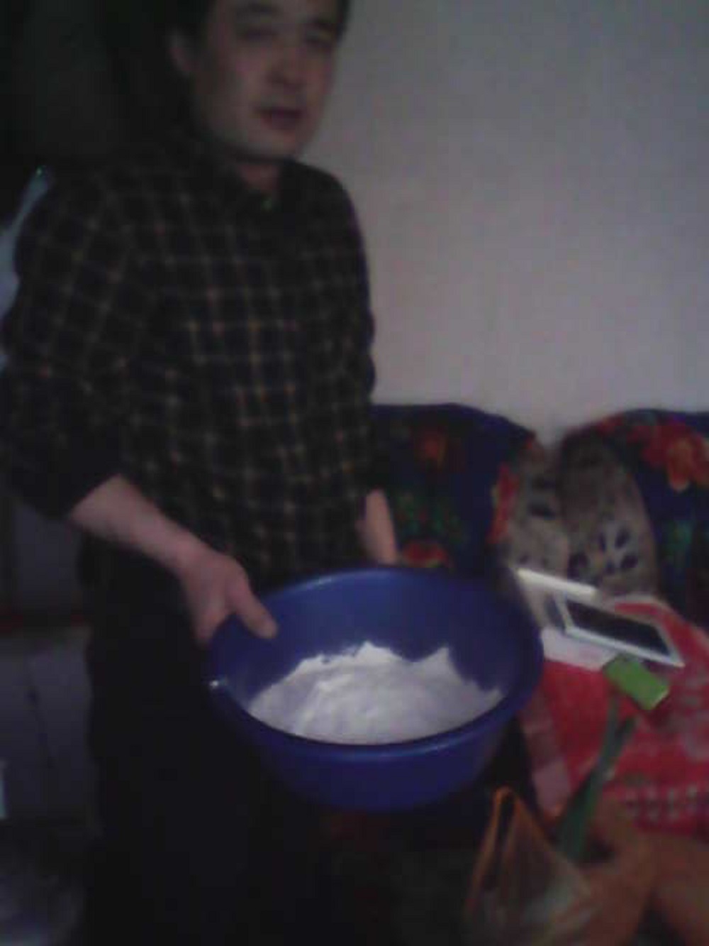 爸爸第一步开始和面,爸爸有舀来一碗水,于是,爸爸就开始了,刚开始,爸爸把水倒多了,他又赶紧往盆里倒了些面,结果面又硬了,接着他又往盆里面倒了些水......,反复几次,爸爸揉了一大团面,而爸爸的脸上也染上了零零星星的面粉。我看着爸爸的样子,大笑不止。