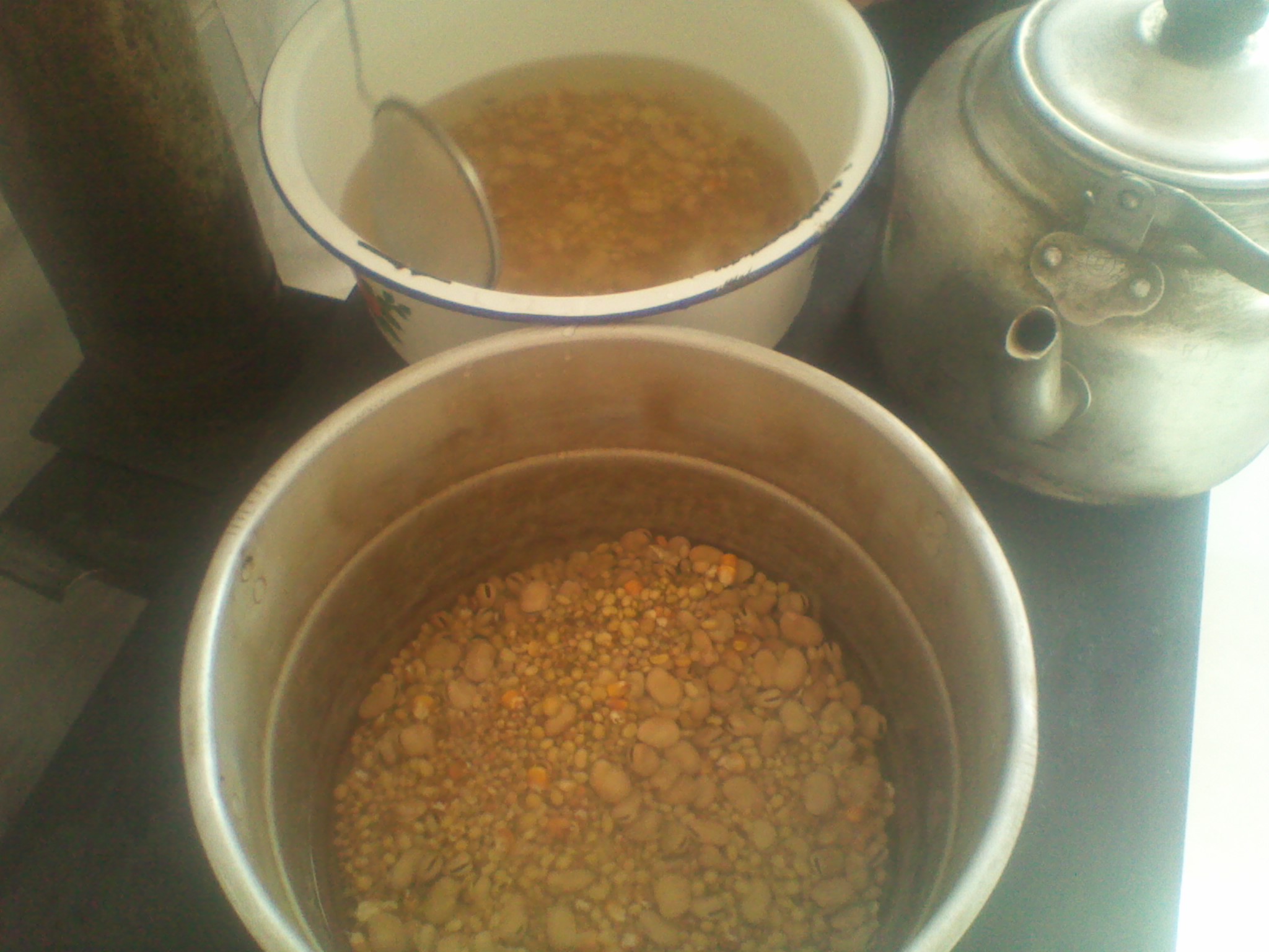 除了腊八粥,我们还吃那种用玉米面做成的饭,我们当锅中的水开始沸腾的时候,放进玉米面,边放边搅,直到它成了一个整体。我们这边称这种面为"糝面"。