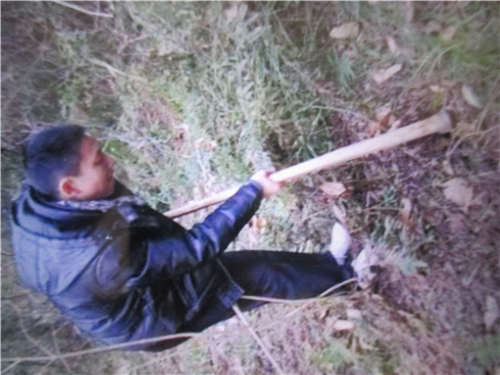 舅舅拿着一把大锄头,把他觉得折耳根多的地方用锄头挖出来,还用锄头把比较硬的泥土敲散。