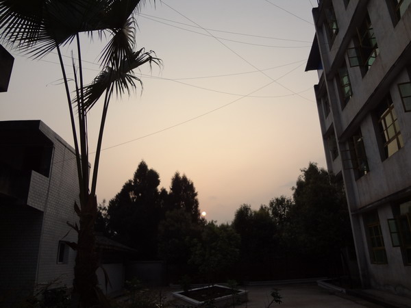 教学楼后边还有有个空地,里面有花坛,旁边还有郁郁葱葱的道旁树,找个角度你可看见落日余晖里的校园一角也是很美的!
