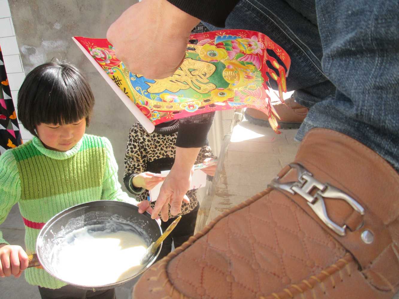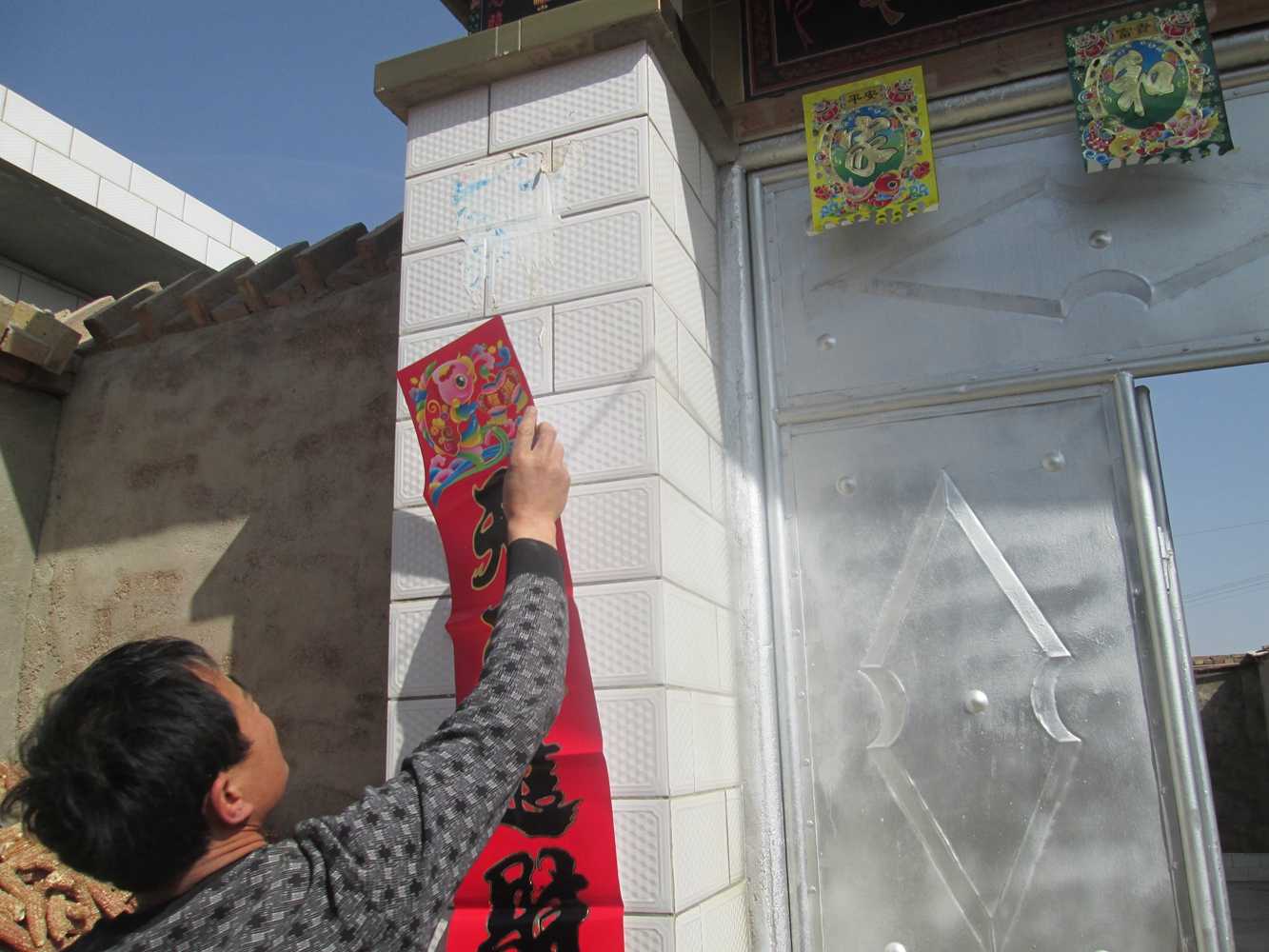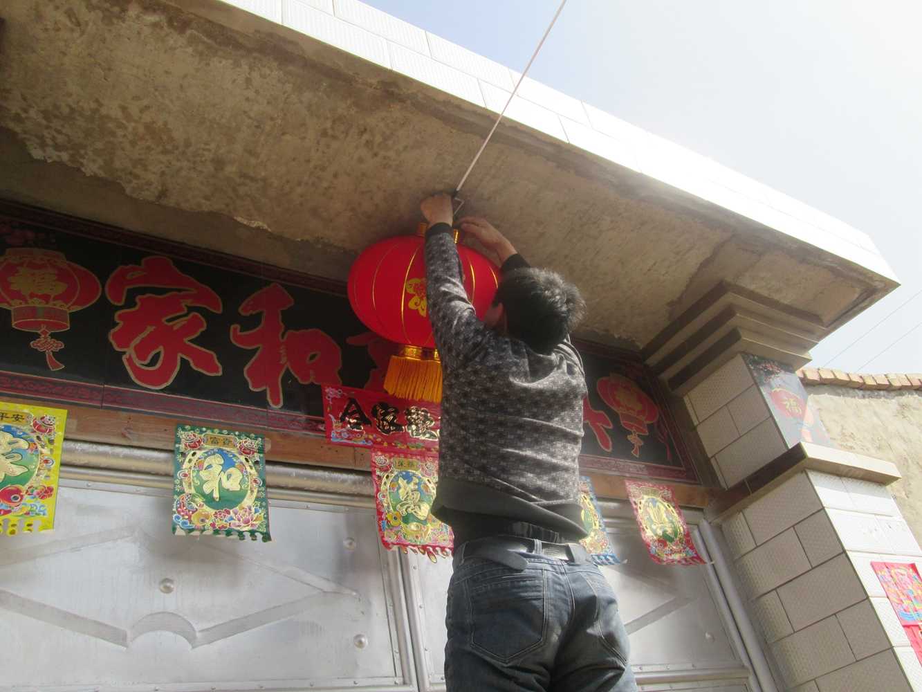 到了正午,我们已经准备贴对联了,我们先做好浆糊,把对联准备好,然后抬出去一个高架子,让爸爸站在上面,我负责给爸爸拿浆糊,递对联,爸爸开始贴。我们在大门上贴了一个家和万事兴,又挂上了一个大红灯笼,横批是"合家欢乐",两边分别是"天天追财年年富"和"步步好巨事事成",还贴了两个门神,他们分别是"秦叔宝"和"尉迟恭"。