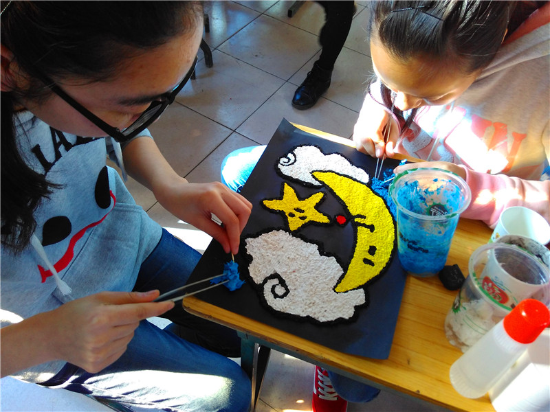 然后再给它弄平整,摸上去软绵绵的就可以了,月亮做好后还有白云和星星用同样的做法把卫生纸夹到模型上去在用镊子和牙签给它修整修整就好了。做手工画是一件很有趣的事,也是一件考验人耐心的事,俗话说:"功夫不负有心人,铁棒都能磨成绣花针"。一切弄好后就大功告成了,最后就是将手工画放在太阳下进行晒干水分就好了。同桌的手工画做的很漂亮,不妨你也动手试一试吧!