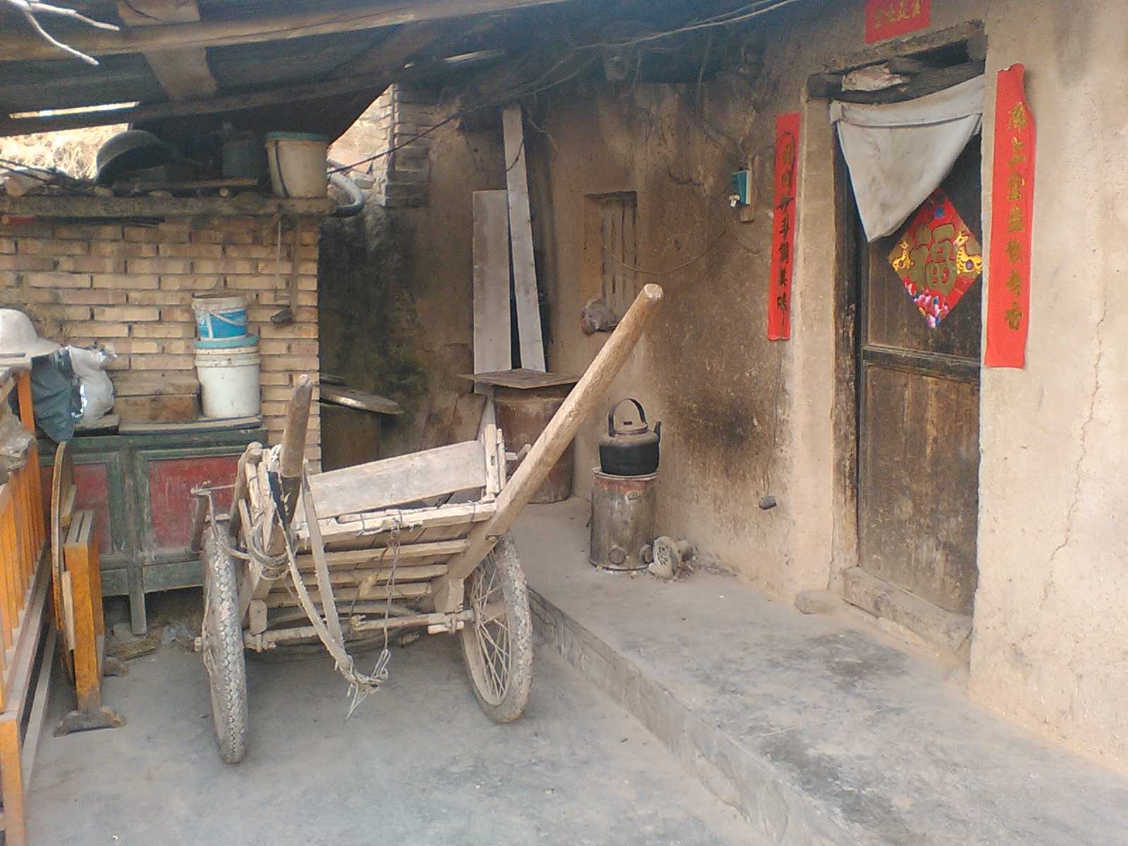 上坡的时候很费力气,有些人家攒上几年钱,买了三马子,但在这里的“羊肠小道”上很少用到,平时还是用架子车。人们对架子车的使用还是很频繁。这就是家乡的架子车。