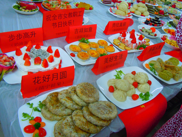 在 “三•八”国际劳动妇女节来临之际,我们学校组织女老师们参加区教育局举行“花式点心”制作比赛。