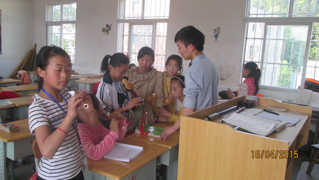 声音最为动听的还是从临时音乐教师发出来的。那个教室是张老师教同学们乐器的。他教两种乐器,一个是葫芦丝,一个是笛子。老师把同学们分为两个组,先给出一个曲谱,然后叫他们用自己的乐器吹出老师给出的曲谱,老师细心教导,等到下一节课的时候在合奏出曲谱。