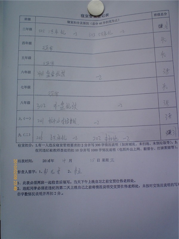 各班的公区,教室,寝室如果被记了,列在公开的名单上,那执勤的人就会写检讨,检讨的字数:扣两分三百字,四分五百字,六分一千字,到规定时间未交,加倍,在集合时当着全校师生朗读,巡查的人必须要公正,不能徇私,维护自己班,否则也会受到严厉的处罚。