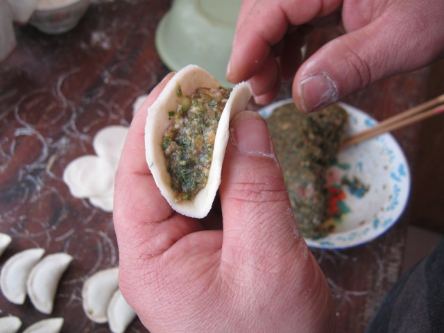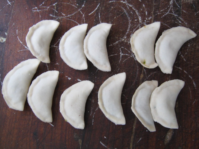 妈妈负责做好面皮子。妈妈先用淡盐水和面,然后把面揉搓均匀,用擀杖擀好,用圆柱形的大茶杯用力一按,一个面皮就成功了,非常规则。