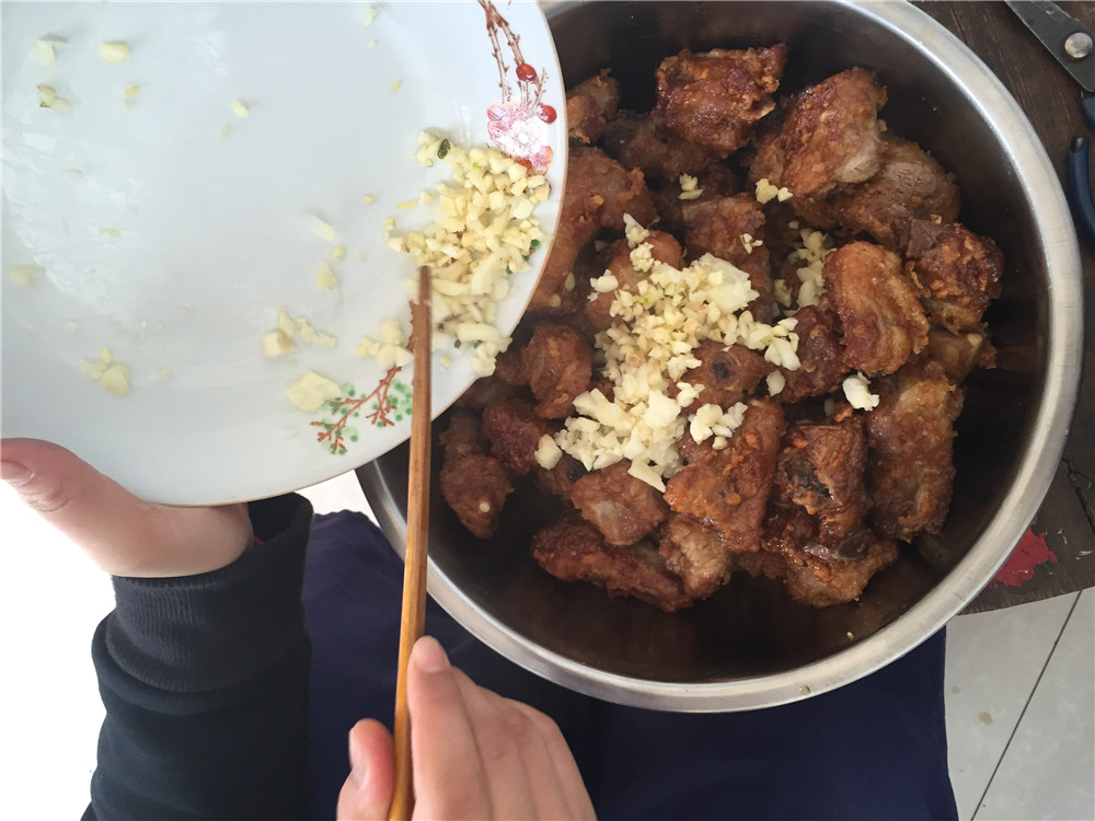 首先,先选一些排骨,排骨不能太大,也不能太小。紧接着将这些排骨放在盆子里,倒上"生抽"酱油和陈醋,酱油和醋要比较多一点,倒好之后呢,在排骨盆子里再放上少量的盐巴,腌上半个多小时,腌好之后,再加入干粉,搅拌均匀。接着就是把油锅加热,把排骨一个个的放进油锅,等到排骨凝固的时候再去翻动,在等炸排骨的过程中,在切一些蒜末,等到排骨的颜色变黄了,就可以把排骨捞出来,并且放上以经切好的蒜末、白糖和醋,搅拌均匀,盛在碟子里,这样一份糖醋排骨就做成了。