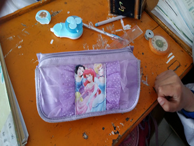 铅笔盒是每一个同学必须有的文具。铅笔盒一共有两种类型:一种是笔盒,一种是笔袋。有这么一个笔袋,它的颜色大底是紫色,上面有三个公主,一辆马车和一座粉红色的城堡,而且这几个公主都特别漂亮。