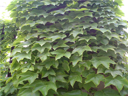 爬山虎叶尖一顺儿朝下,在墙上铺得那么均匀,没有重叠,也不留一点儿空隙。一阵秋风吹过,墙面上发出一阵阵沙沙响声,好像它们在说悄悄话呢!
