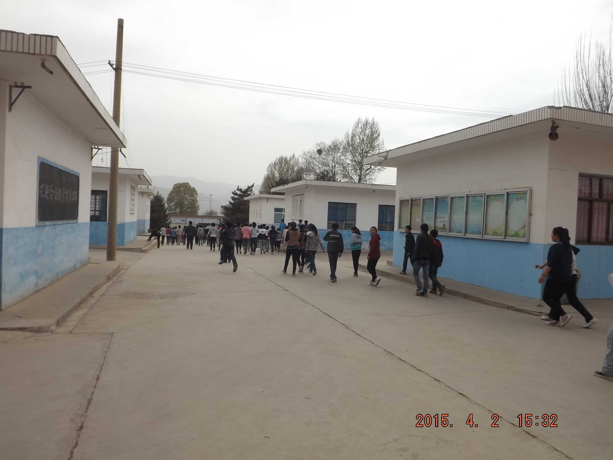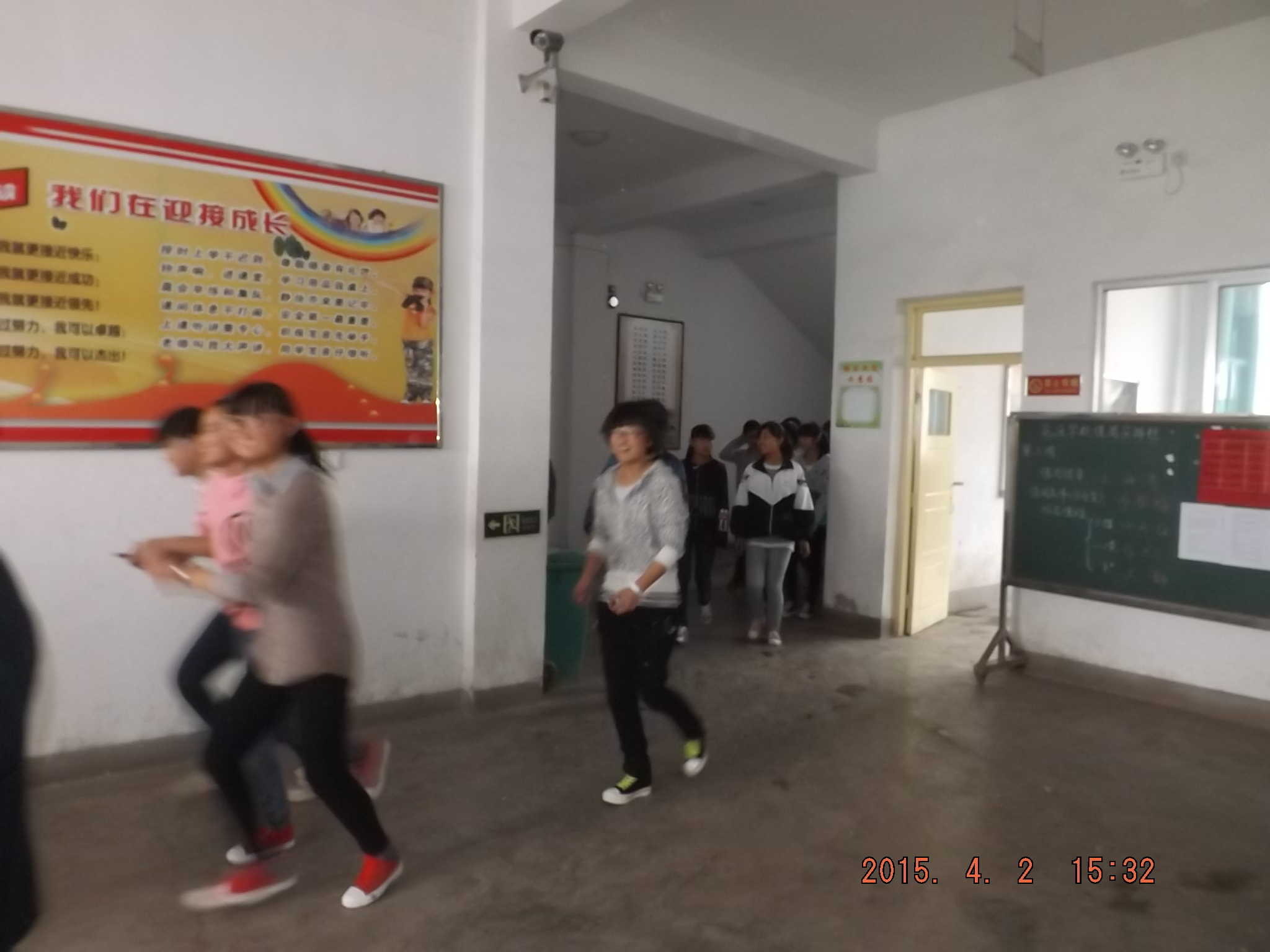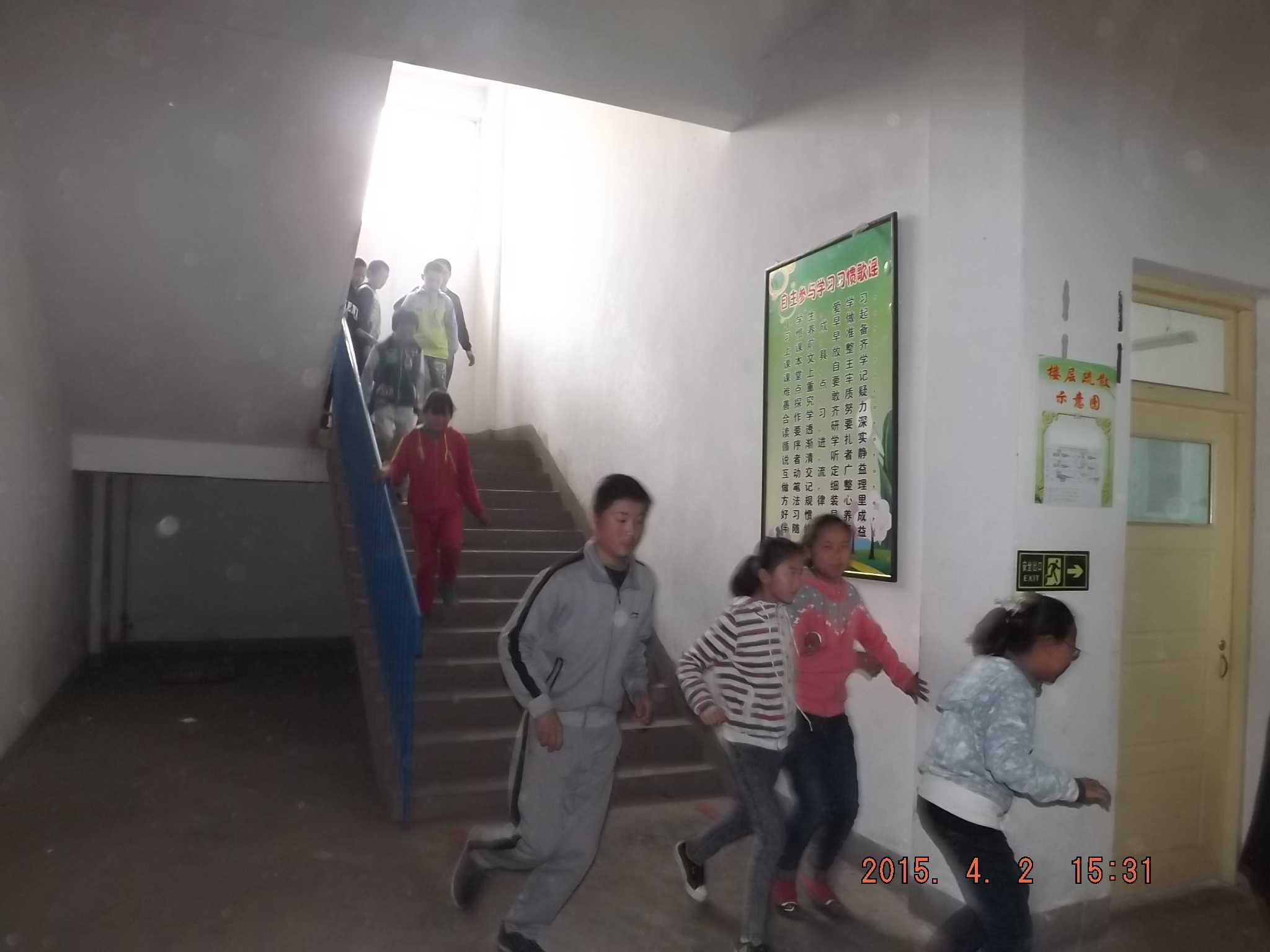 在演练之前老师已经给我们安排好了,前四排的同学从前面出,后四排的同学从后门出,因为我们教室在 教学楼的东边,所以我们出教室门以后从东边的楼梯下楼。