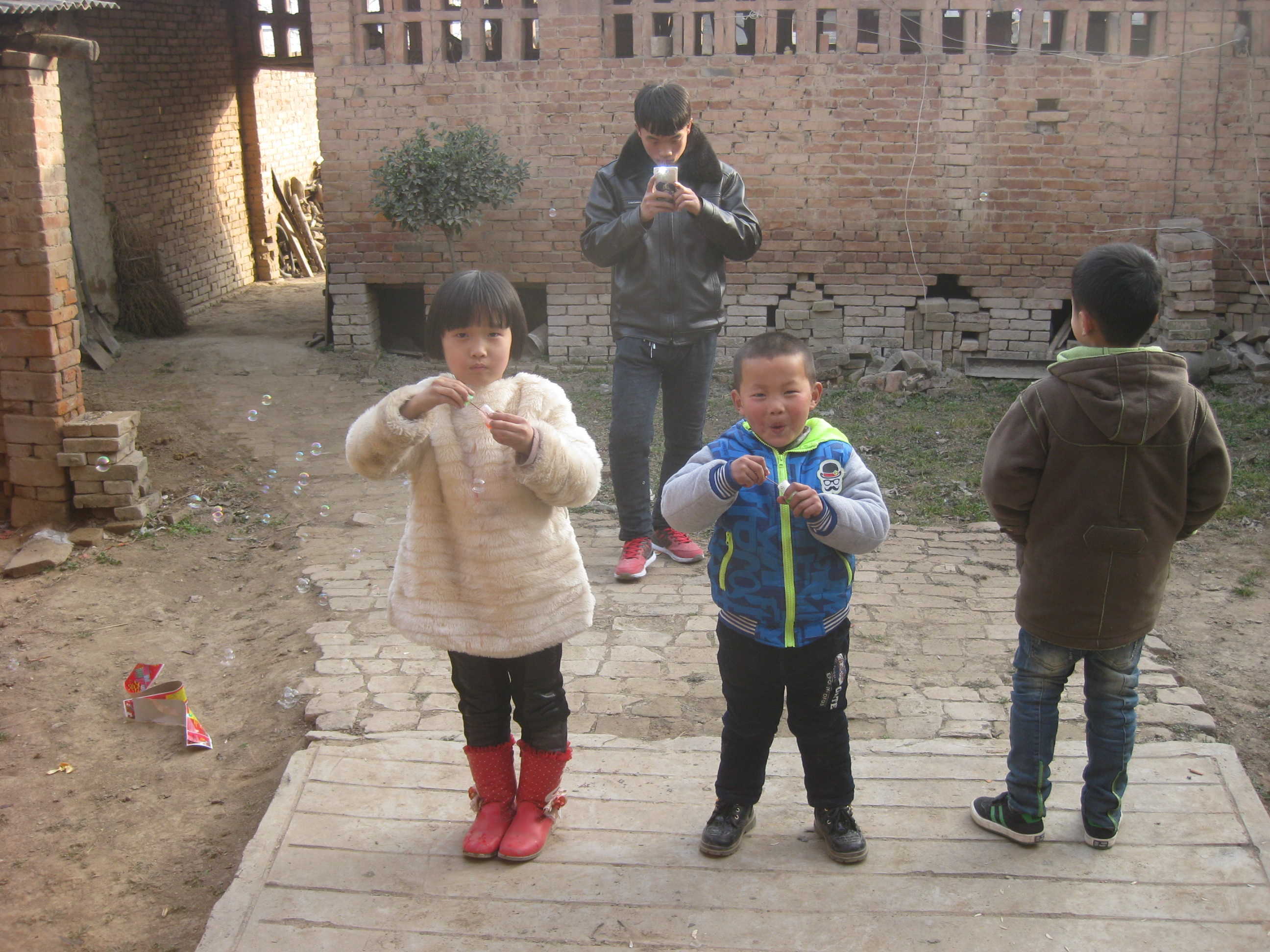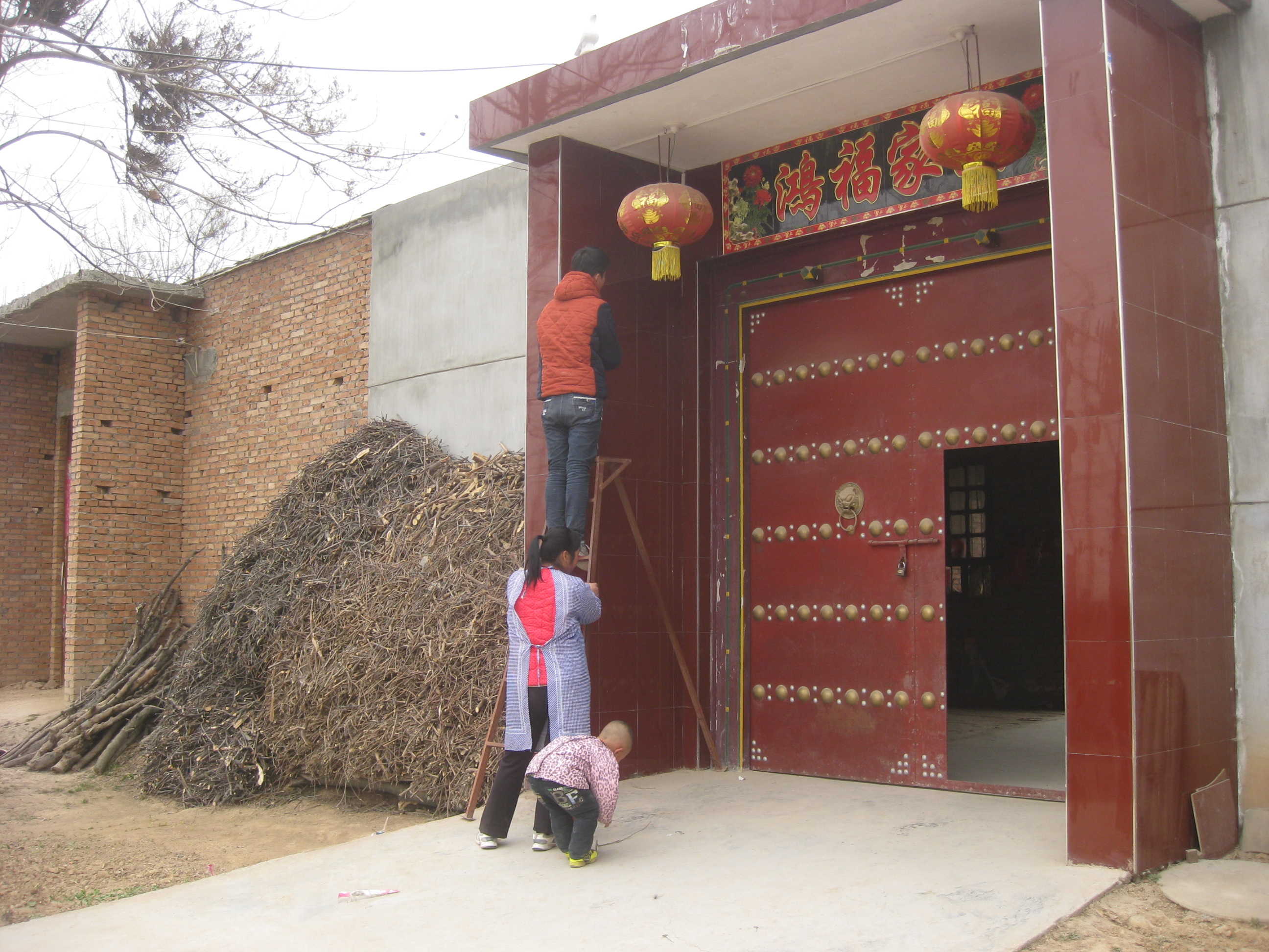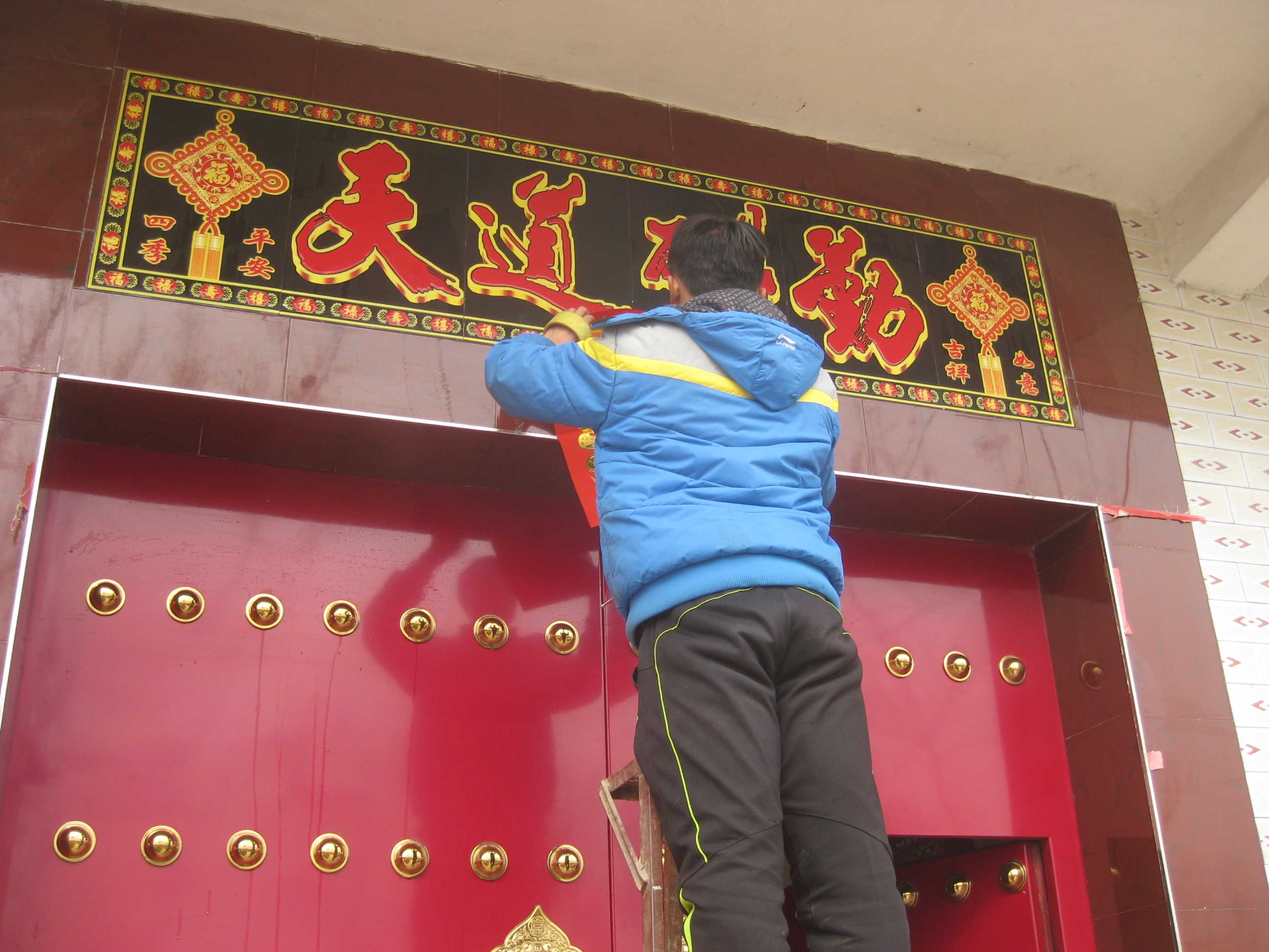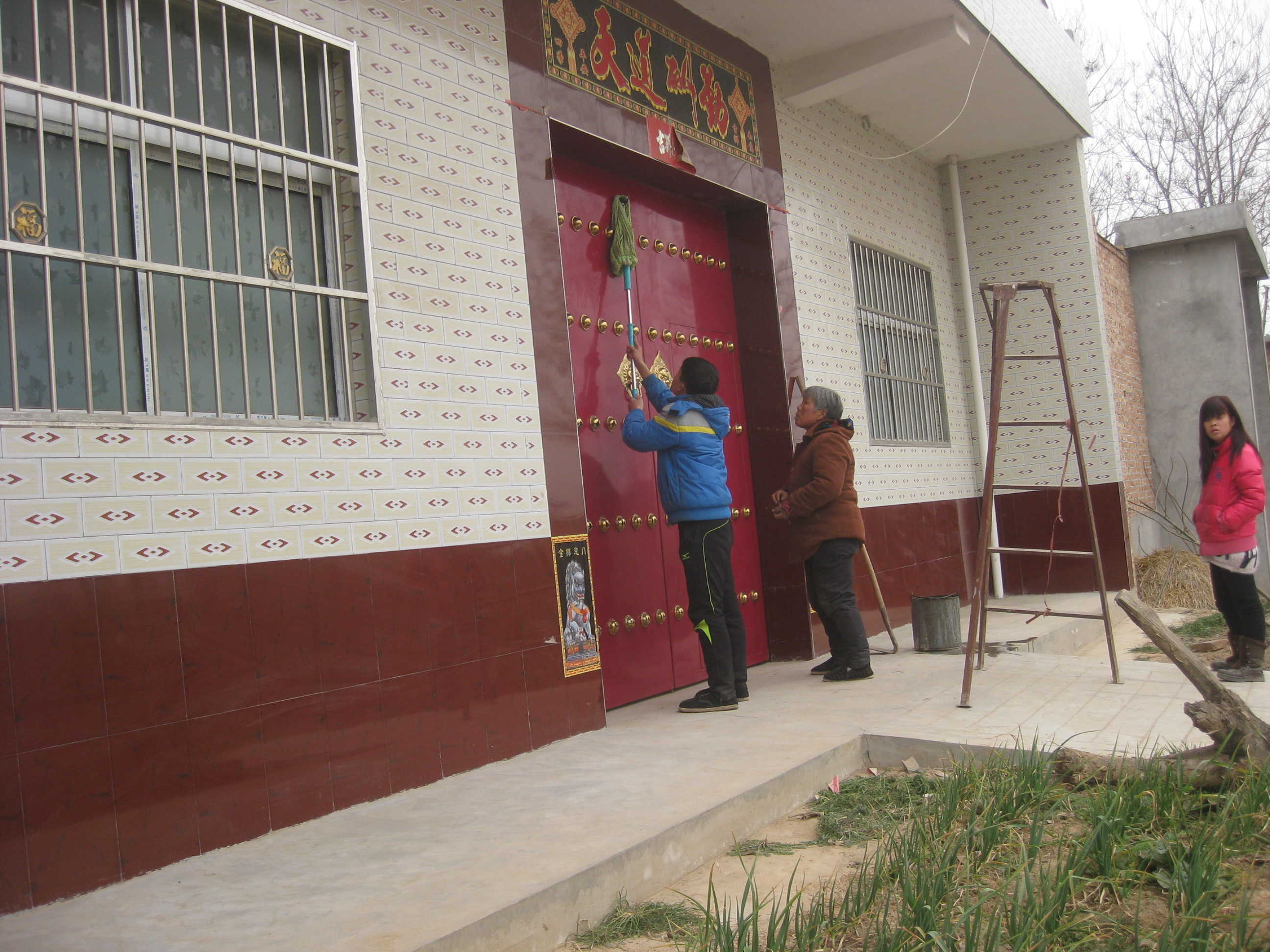 我们家除夕这天也贴春联,哥哥端着梯子,我拿着抹布,奶奶拿着对联,全副武装着去贴对联。