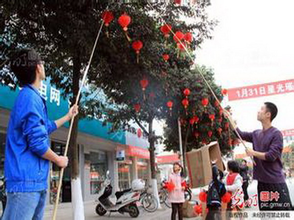 吃完饭之后,妈妈和我就开始贴春联和挂灯笼。我的任务是挂灯笼,妈妈就贴春联了。我提着小灯笼高高兴兴地跑出家门,撕开外面的透明袋,拿出一个小灯笼,撕下双面胶,两只手灵巧到一转,再把贴有胶那边贴到没有胶的那面,又用手一捏,一个小灯笼就诞生了!小灯笼粘好后,我把它小心翼翼挂到树上。接着,我有粘了十九个小灯笼,再一个一个挂上树。我的灯笼挂完后,蹦蹦跳跳地去告诉妈妈:"我挂完了,怎么样?"