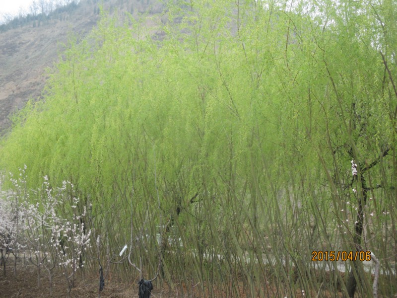 柳树。她们的确有粗壮的树干,可是,她们的枝桠与它们的身体大相径庭。一条一条,又细又长又软。她们的叶子也和枝条一样,又细又长。她们只有主干部分比较粗壮,其他的枝条则细细长长的拖到地上,好像大姑娘的长辫子。雨水会帮她清洗枝叶上的灰尘,清风会帮她梳理长发,不一会,太阳就会帮她晾干头发。不过,小孩子常常会用她的枝叶来编成草帽,戴在头上,图个凉快。