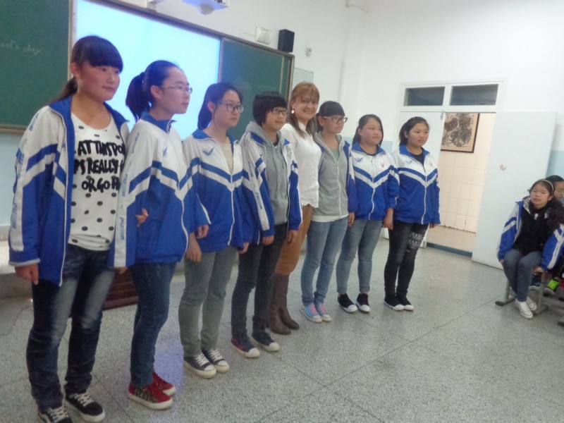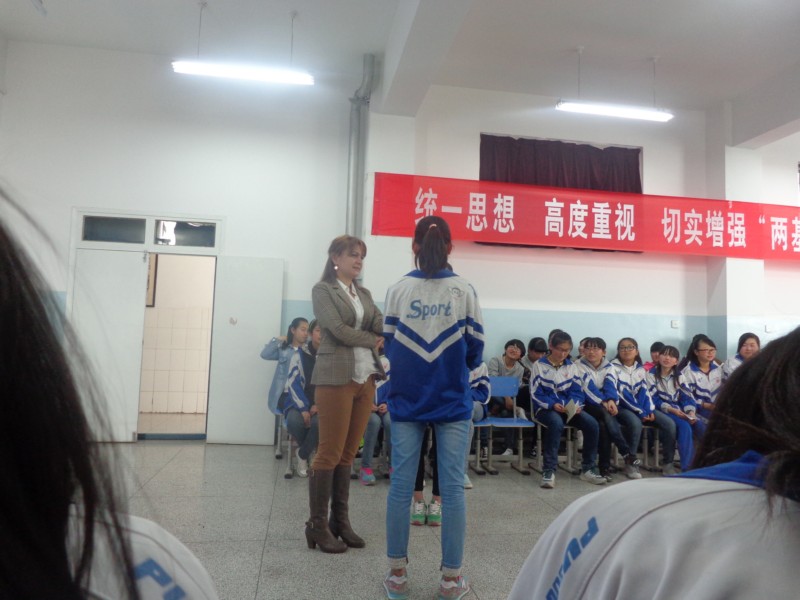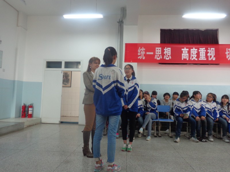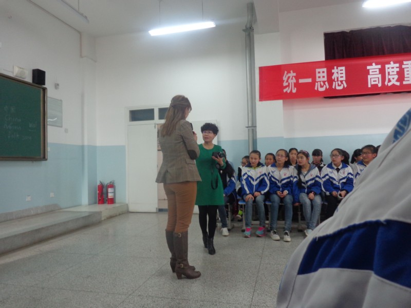 外国友人进来了,她是一个典型的西方大美女。她有着宝石一般的大眼睛,英挺的鼻子,樱桃般的小嘴,还带着一对粉色的耳环。她的头发是金色的大波浪卷,很漂亮。她的中文虽然不是太好,但还是可以听得懂我们说什麽。她首先给我们做了自我介绍,可是非常抱歉的是我没有记住。她的手提包里装着很多的棒棒糖,她在PPT上给我们介绍了宗教,她国家的建筑特色还有一些民风民俗。每当我们回答对她的问题她就会给我们棒棒糖。她让我们用英语对话,唱一些英文歌曲给她听。在她的演讲快要接近尾声的时候,我们一起和她照相留做纪念,校长为她颁发了一个奖项。