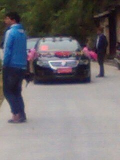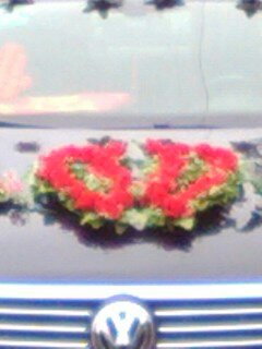 迎亲的队伍来了,开着小汽车,很帅气! 车上镶着花很漂亮,摆成一个爱心,好可爱。