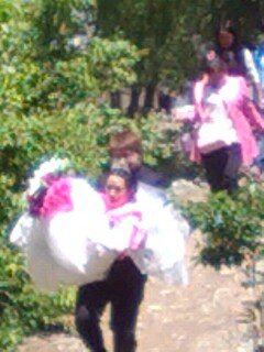 新娘子要走了,新郎抱着捧花的新娘,一路狂奔,我站在桥头,拍下这一幕。