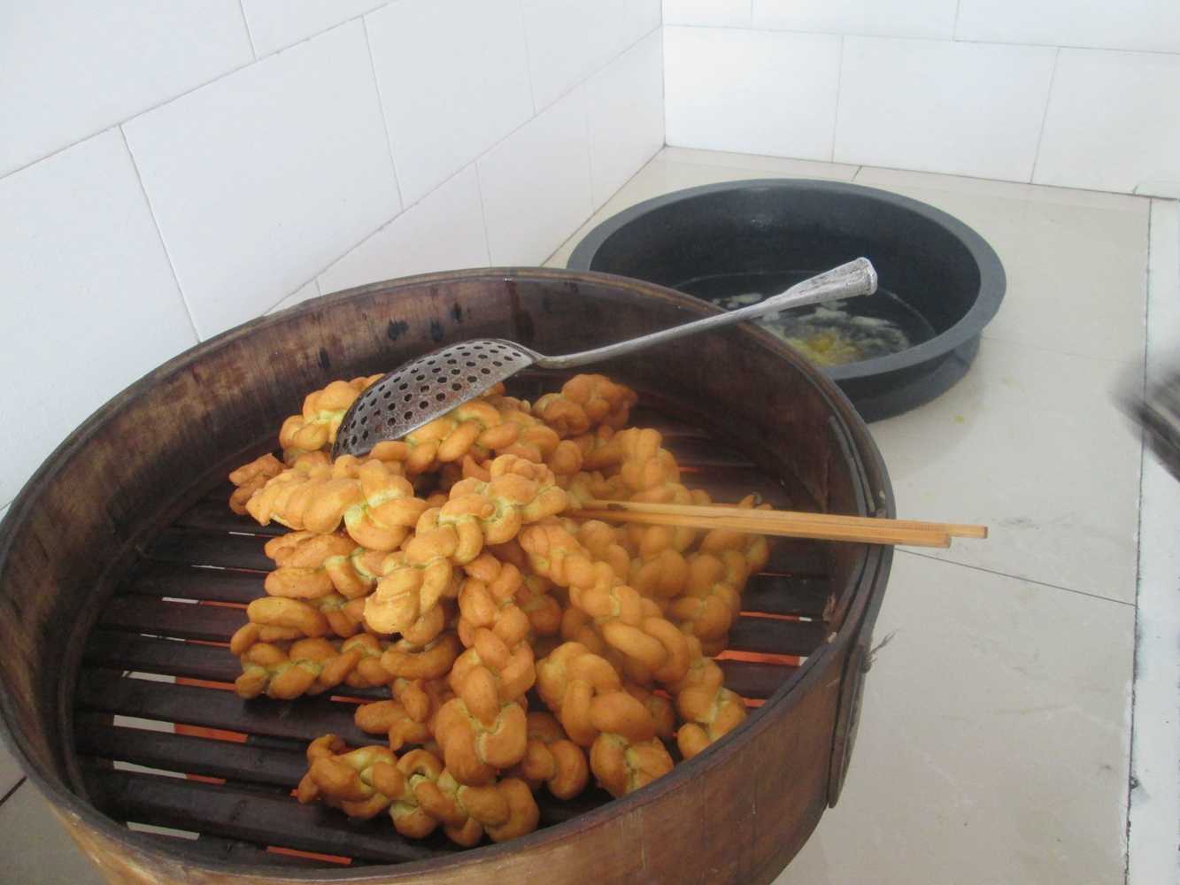 接下来,我们开始做花卷,我又跟着掺和,但我感觉花卷要比包子好做多了 ,虽然我做的没有妈妈做的好看,但我却很高兴,我们忙碌了一大早,终于蒸完了。我们休息了一会,吃了些刚蒸的包子和花卷,又开始炸。首先炸的是麻花,这个我会做,于是,我们开始揉好面,擀好,锲成一条条,开始辫,我们每个人都使劲辫,终于把那么多的面给辫完了。然后把它放在油锅里,让它"跳舞",等它"跳"够了再把它捞出来晾在一边。接下来,又开始做油饼,它所走的程序和麻花差不多,只不过它不需要辫,它只要擀成一个个较薄圆饼,再在上面划上两刀就行了。我们有忙碌了好久,终于忙完了。