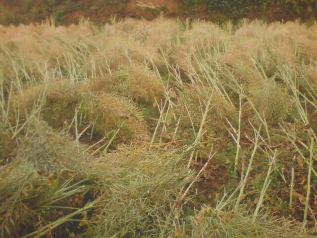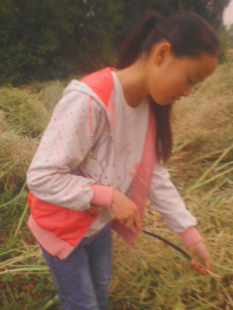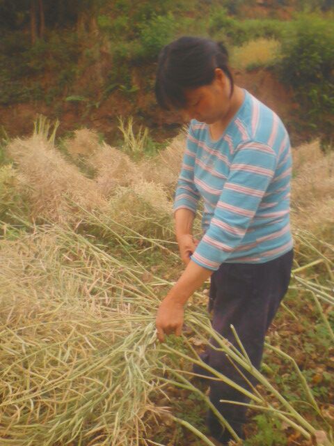 继续割着,突然妈妈的手被菜杆给扎了一下,一点菜杆渣陷在肉里,他自己怎么也弄不出来,于是让我来帮忙,我拔了很久,终于拔出来了,我们又恢复了"工作"。被割了的油菜籽被我和妈妈丢成一个小小的堆,妈妈说":现在的油菜籽有一些还没成熟好,要在田里放几天才能开始打菜籽。"一个个的小堆是为了以后打的时候方便拿。