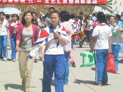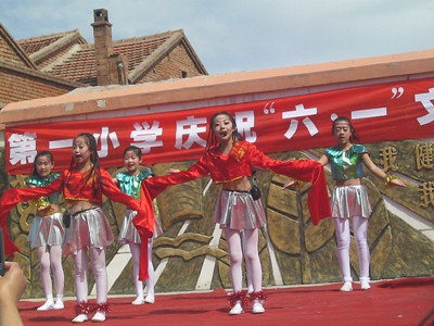 在每年的6月1日,学校都会举行庆六一文艺汇演暨表彰活动。今年,学校如往常一样,举行活动。参加这次活动的人有:学校的所有学生和老师,各位领导,总数可达两千多人。举行典礼的地点在赤城县第一小学。主席台在操场的北面,主席台上摆着一排桌子,桌子上铺着红布,这是学校领导的位置,主席台的两侧挂着一条条彩旗,使整个操场都显得喜气洋洋。在主席台的前方还挺立着一根旗杆。