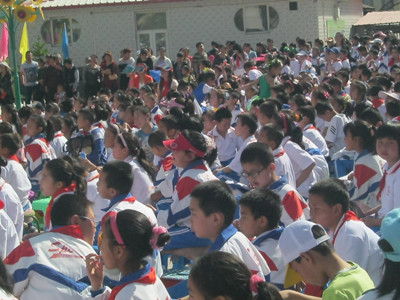 举行典礼的地点在赤城县第一小学。主席台在操场的北面,主席台上摆着一排桌子,桌子上铺着红布,这是学校领导的位置,主席台的两侧挂着一条条彩旗,使整个操场都显得喜气洋洋。在主席台的前方还挺立着一根旗杆。
