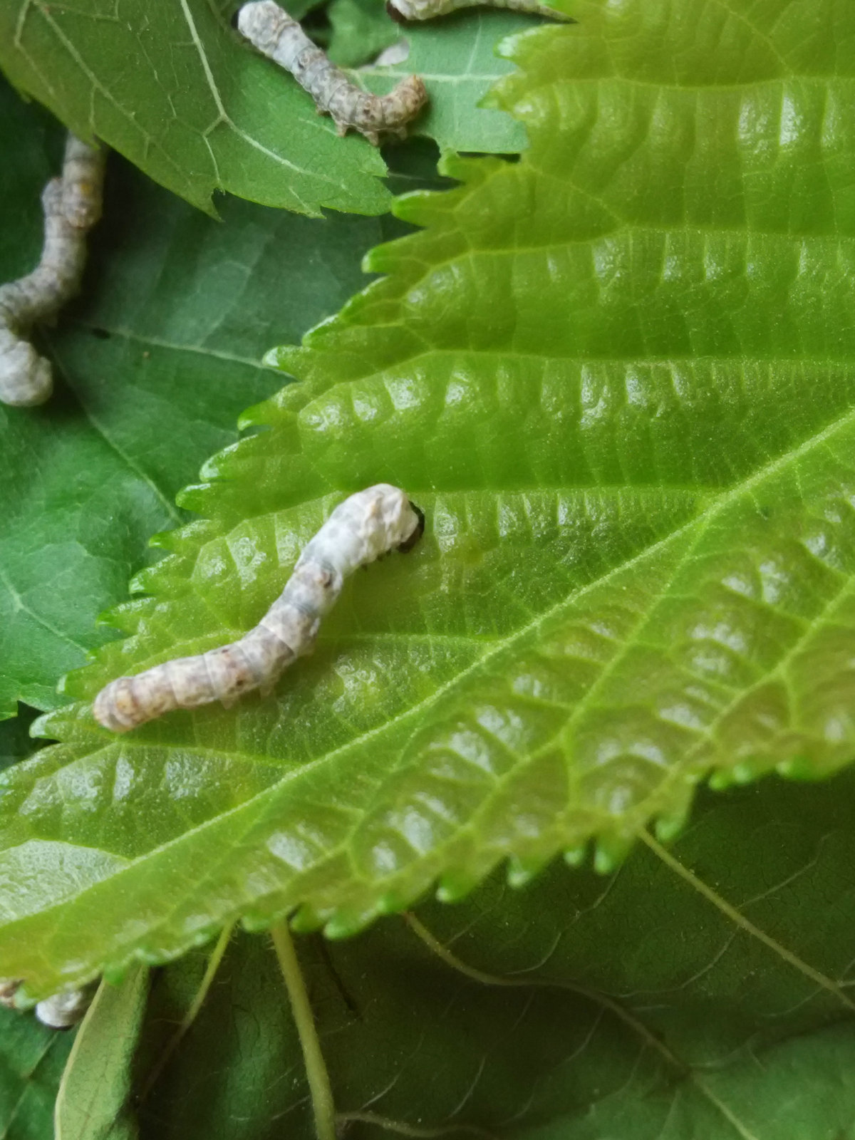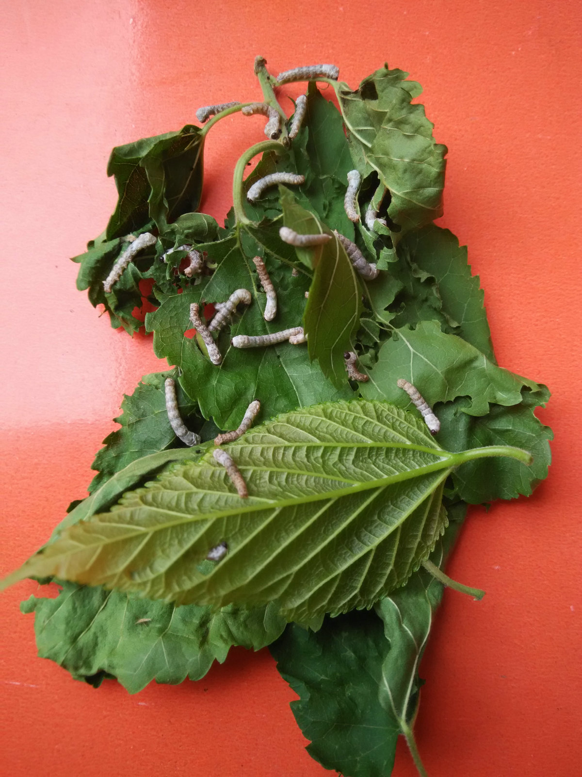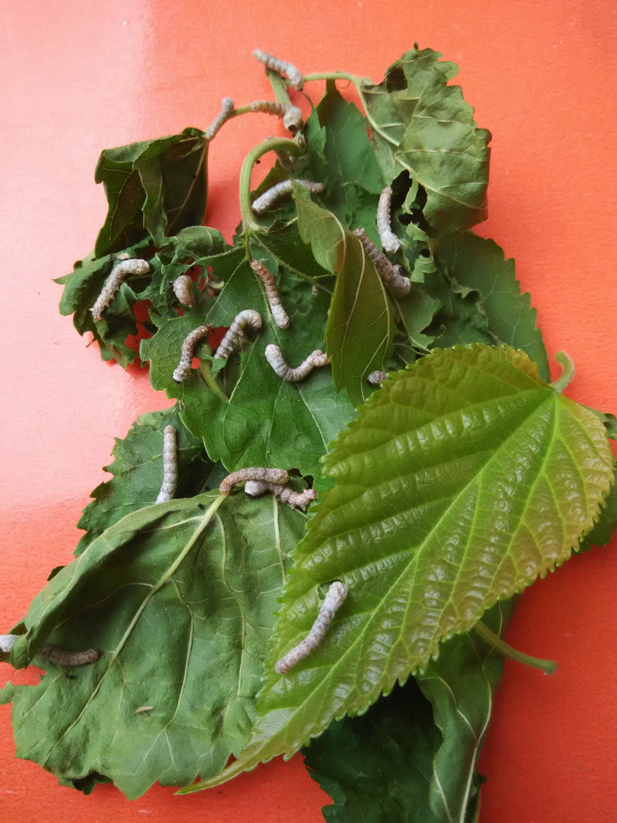 蚕宝宝到了四十天后,就逐渐体现出老熟的特征:先是排出的粪便由硬变软,由墨绿色变成叶绿色;食欲慢慢减退,食桑量也开始下降,胸部呈透明状;继而完全停食,体驱缩短,腹部也趋向透明,蚕体头胸部昂起,口吐银丝,左右上下摆动寻找结茧的场所。听说蚕蛾结茧需要两天多时间,约十天后,羽化成为蚕蛾,破茧而出,雌蛾花一个晚上可产下几百个卵,然后也会慢慢死去。