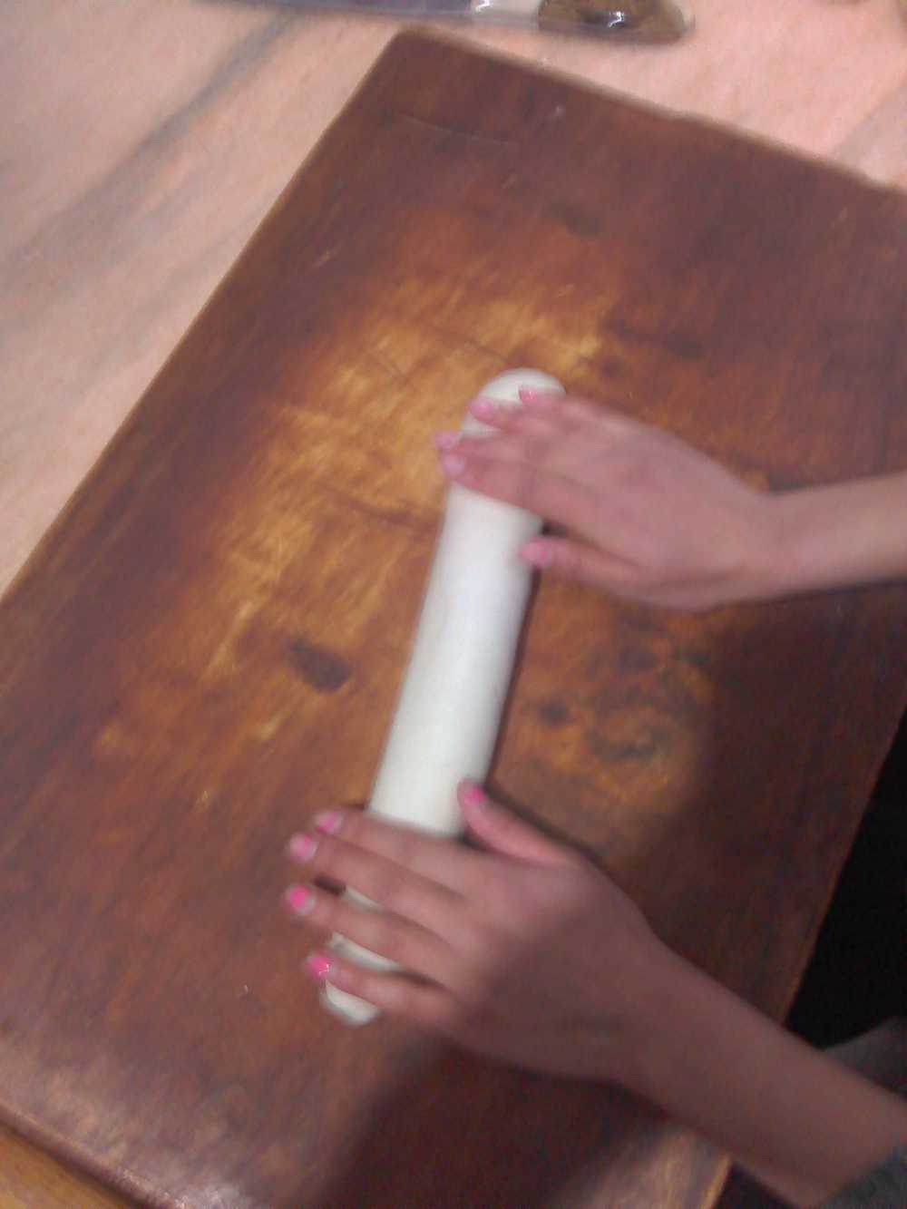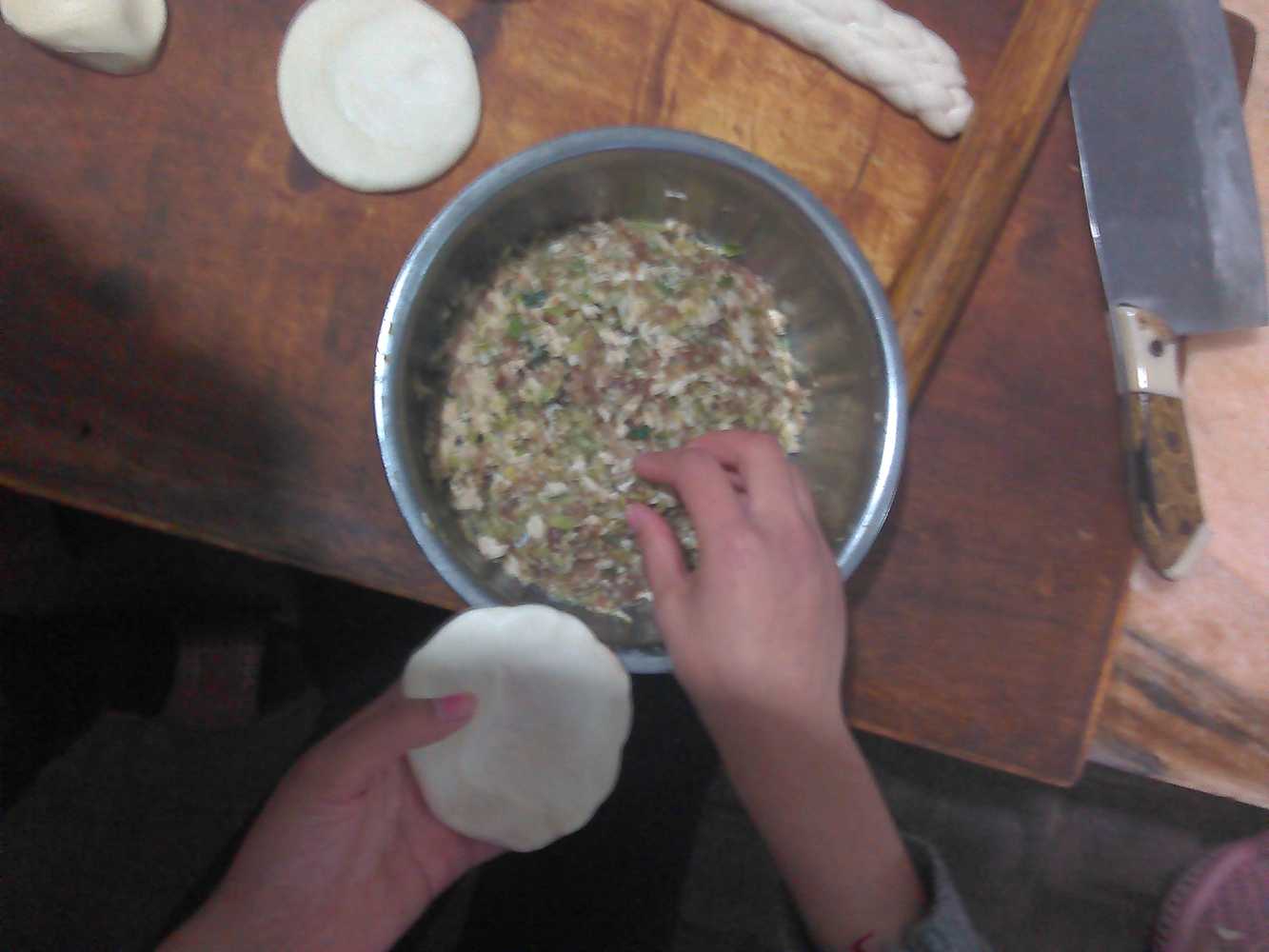 馅儿准备好了,就开始进入正题了。我来擀面皮,妈妈来包包子,这样即省时间又省力。其实擀面皮也是一种学问,如果没有技巧就会擀着手疼,我就没有技巧。我这是第一次擀面皮,还是比不上妈妈擀的好。
