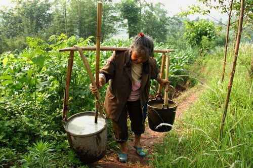 那天,奶奶就出来抓"壮丁"了。我正坐在椅子上陪爷爷闲聊,奶奶就走到我面前说:"去担两个半挑粪把茄子灌一下。"她见我愣在那里,又说:"想吃菜,就自个儿出力。哪有叫你白吃的!" 我走到粪塘边儿上,提起大粪舀,在前面的一桶倒入两舀,后面还特意少倒了一些,以防出现像上次那样的意外。我小心翼翼地把粪桶担起来,摇摇晃晃地向前走了几步,肩膀被扁担压得生疼。就这样,我忍着疼一走一晃,难受地走到了菜园里。第二趟时,肩膀就已疼得不行了。不得不在路上休息一下才又重新把大粪担起来。