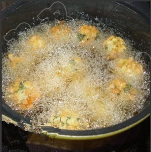 做好了的馍馍还不能吃,还得扎输了才行。最后一道工序就是炸馍馍了。往锅里大约一碗香油,生文火,待香油烧自沸腾时,逐个放入做好的馍(以油能淹没馍为宜)。等馍的一面变黄时,再反过来炸另一面。待馍炸至金黄时,便可起锅了。这时把馍放进口里一咬,那家伙又酥又软又香,好吃惨了。依次炸完剩下的馍,就OK了。