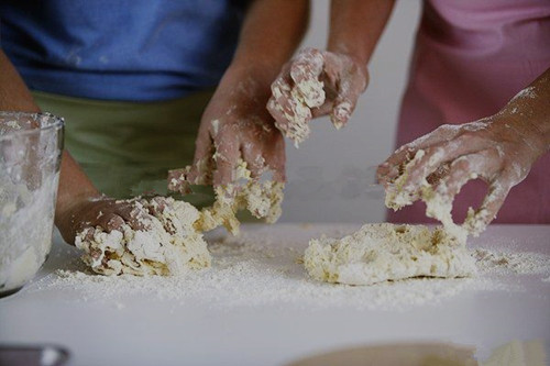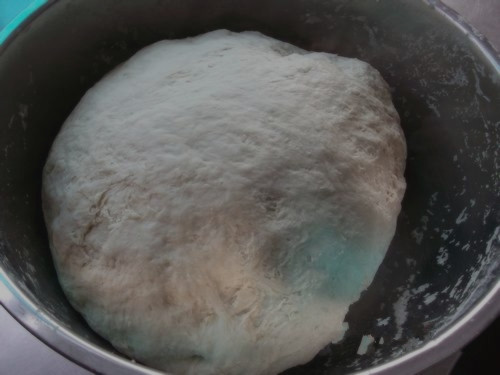 接下来就是和面。这活儿不好干,面和稀了难以成型,和干了炸出来的馍馍口感不好。我向盆子里倒入约两斤面粉,然后一点一点往里边加水,一边加水一边搅拌,等面盆的面粉能捏成小团了,就用力揉,肉上几分钟,面团没有了小颗粒,就可以。